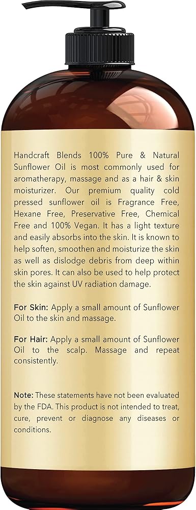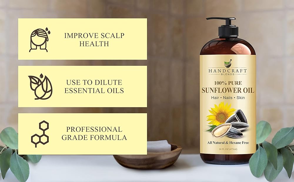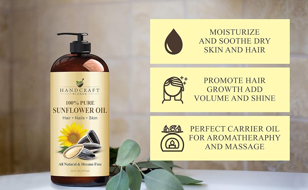 • زيت عباد الشمس النقي للشعر يمكن أن يساعد في تقليل تساقط الشعر وتقليل تكسر الشعر، وبالتالي تحسين نمو الشعر. كما أنه مهدئ لفروة الرأس المعرضة للحكة والقشرة. بالإضافة إلى ذلك، فهو زيت تدليك مهدئ وزيت للجسم. خالٍ من المواد الكيميائية والهكسان والمواد الحافظة ولم يتم الإساءة إلى الحيوانات لتصنيعه.