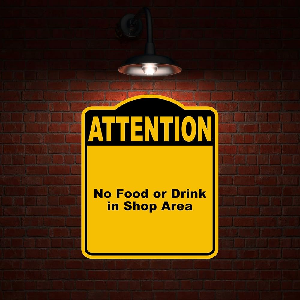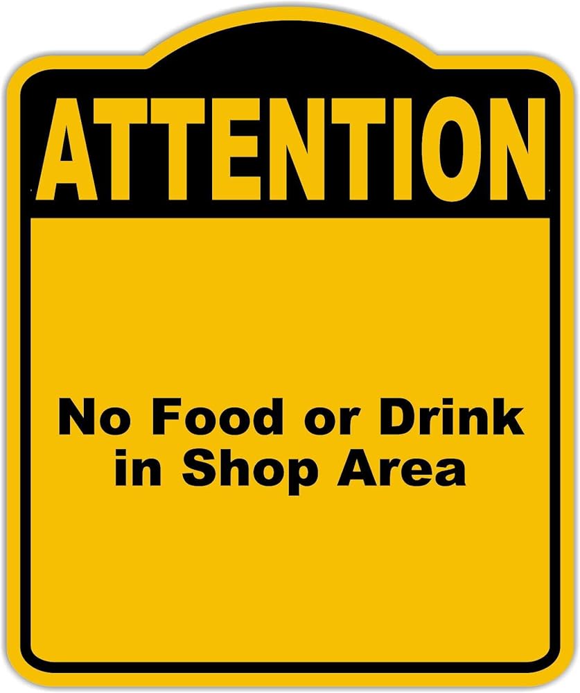 ممنوع تناول الطعام أو الشراب في منطقة المتجر، لافتة مركبة من الألومنيوم باللون الأصفر والأسود مقاس 8.5 × 10 بوصة