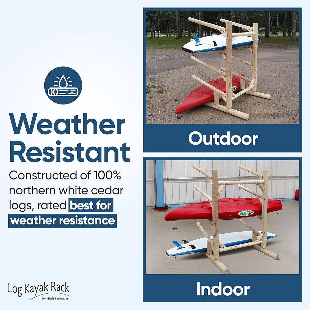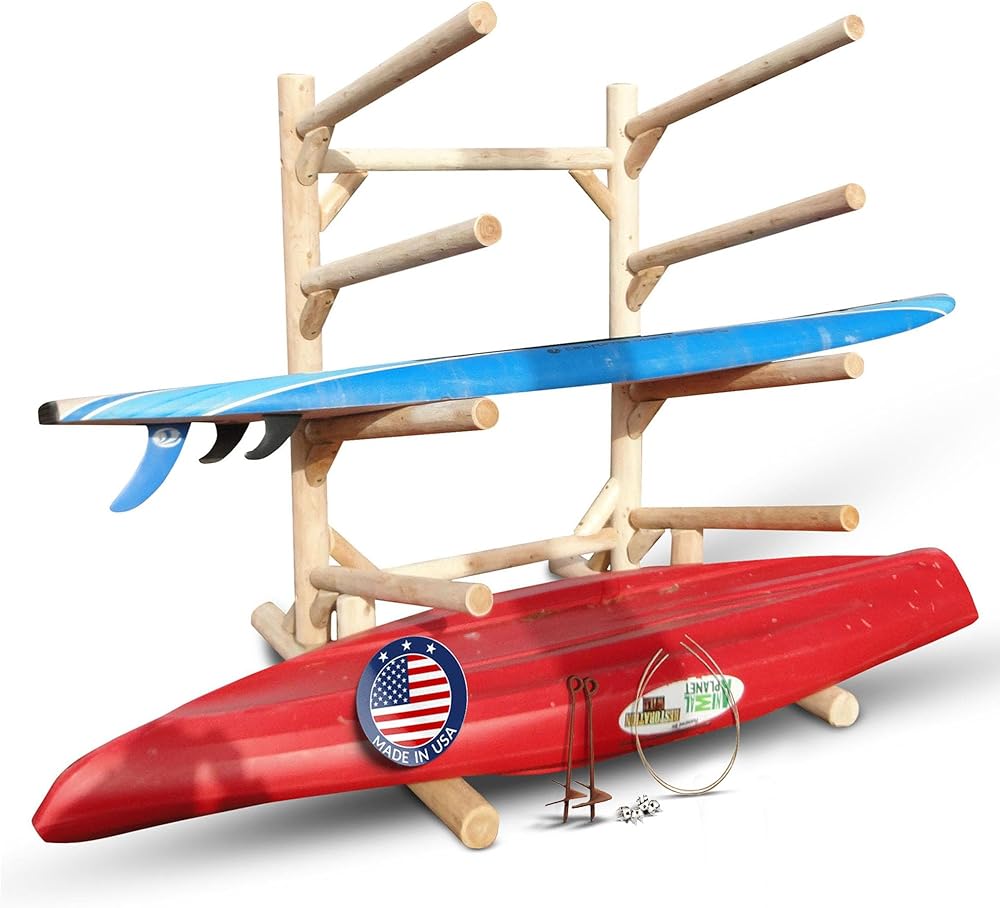 • PREMIUM MATERIALS AND CRAFTSMANSHIP: Built with 100% Northern White Cedar from the Upper Peninsula of Michigan, this freestanding kayak rack offers both functionality and aesthetics, perfect for lake homeowners. Each joint is meticulously glued and screwed for enhanced longevity, utilizing glued mortise and tenon joinery. Handcrafted and finished by skilled Log Artisans in Northern Wisconsin, this rack promises unmatched durability and a beautiful finish that complements any outdoor setting.