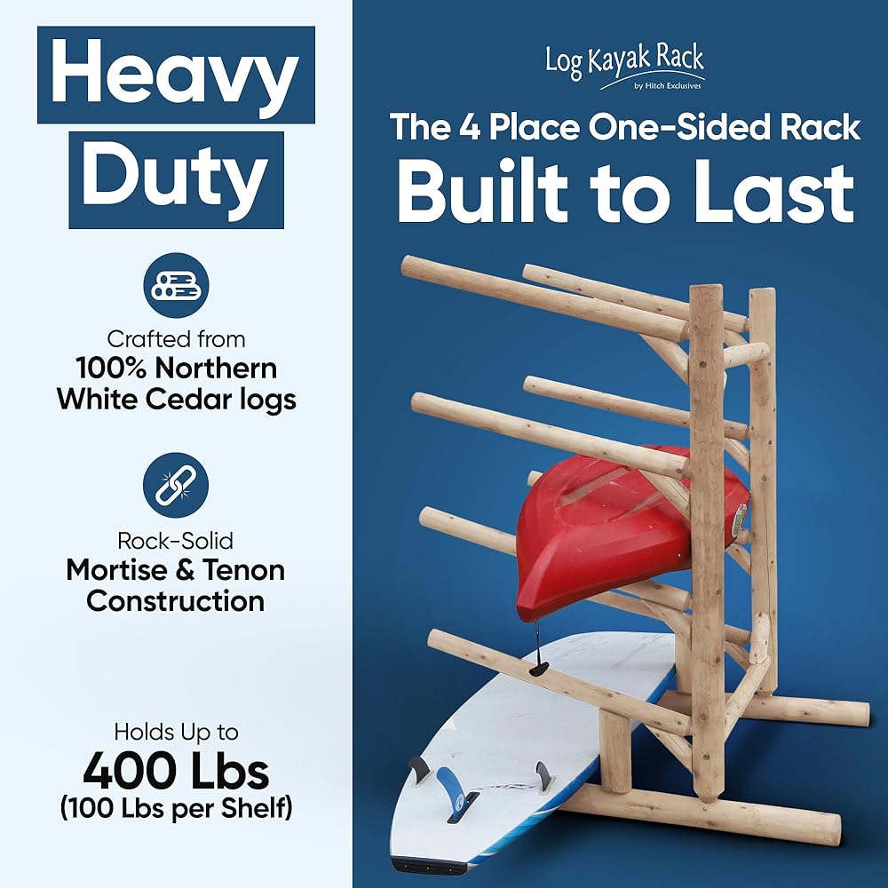 The 4-place One-sided freestanding Kayak or SUP Rack is built with Northern White Cedar from the Upper Peninsula of Michigan. This rack is designed for functionality and aesthetics by lake homeowners. It not only cares for and organizes your boats, but it can also be matched to its surroundings being log construction. With finishing options you can match dock, house, etc... or let it turn silver/gray with no finish, or you can use your own finish if so desired. This rack holds the heaviest of Kayaks, surfboards, and SUPS (Stand Up Paddle-boards). This rack is not designed for Canoes. Each boat can weigh up to 100 pounds. This rack has up to a 400-pound capacity. We have worked with logs for over 23 years crafting log homes, furniture, and kayak racks. Each joint is glued and screwed for longevity. We use glued mortise-and-tenon joinery wherever possible. Hand made and finished by Log Artisans in Northern Wisconsin.