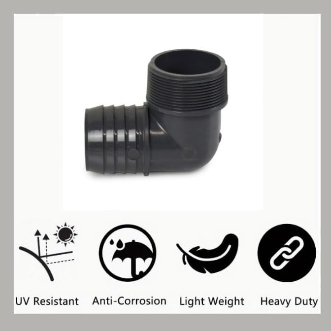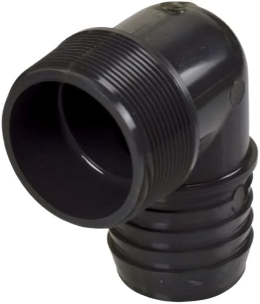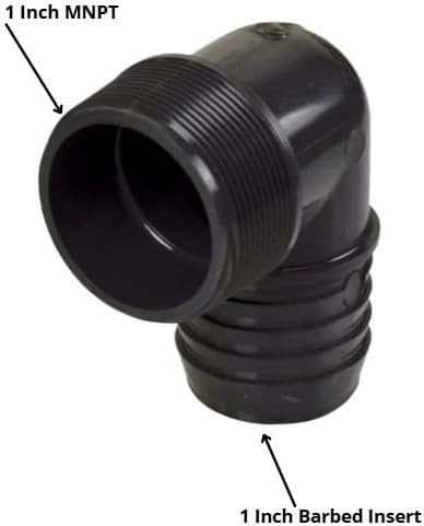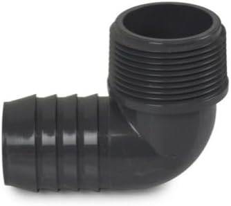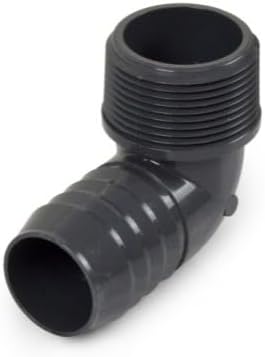 Barbed x Male NPT threaded PVC insert elbow fitting connects size flexible pipe/hose to a female threaded fitting/outlet at a 90-degree angle.