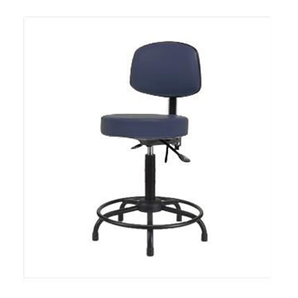 The product Type is vinyl medium Bench height stool with back and round tube base, no tilt, glides, Navy. Country of origin is United States, manufacturer of this product is Thomas.