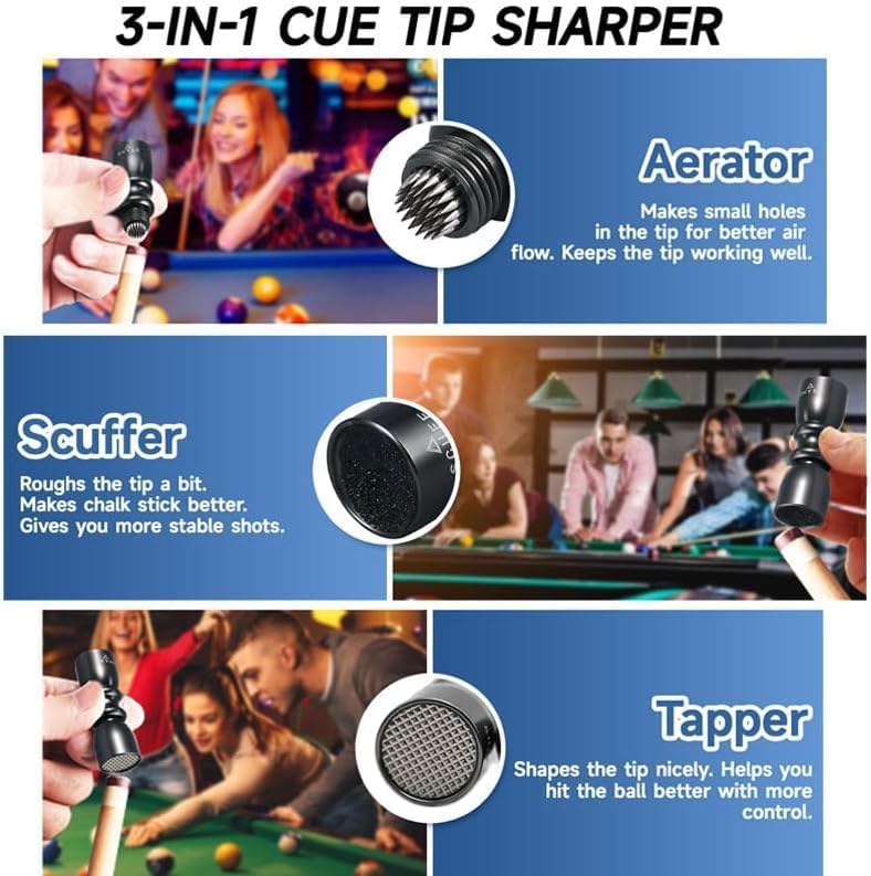 Professional Pool Cue Tool: This 3-in-1 cue tip tool integrates a scuffer, a shaper and an aerator, which can effectively enhance your billiards experience. Whether in professional competitions or daily recreations, it can help the cue perform well and contribute to improving your playing performance