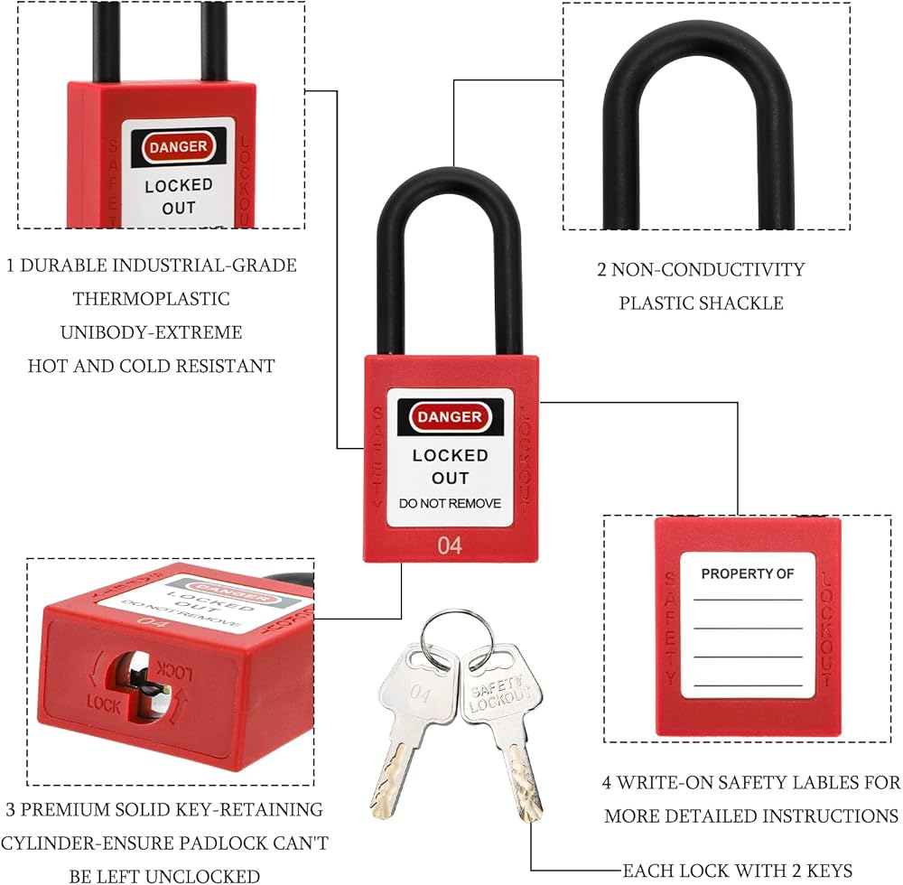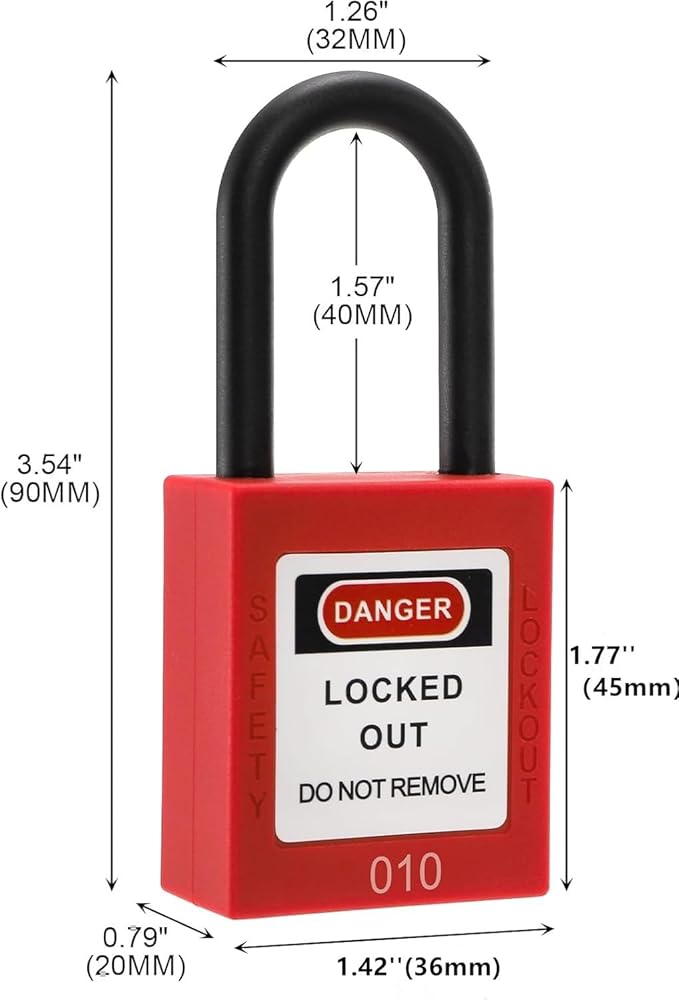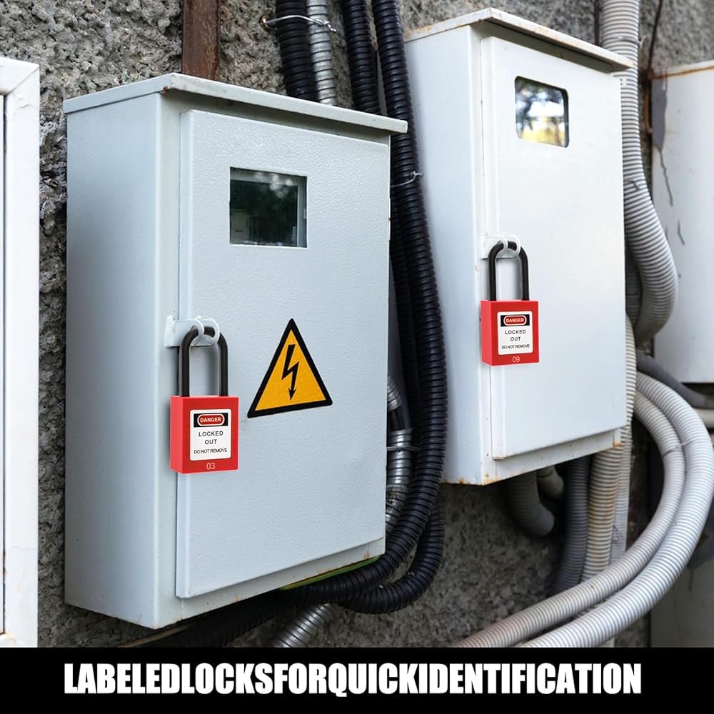 الحزمة تشمل 10 قفل السلامة. يحتوي كل قفل قفل قفل على رقم مختلف ويأتي مع مفتاحين مع نفس رقم القفل (واحد للاستخدام وواحد للنسخ الاحتياطي).
