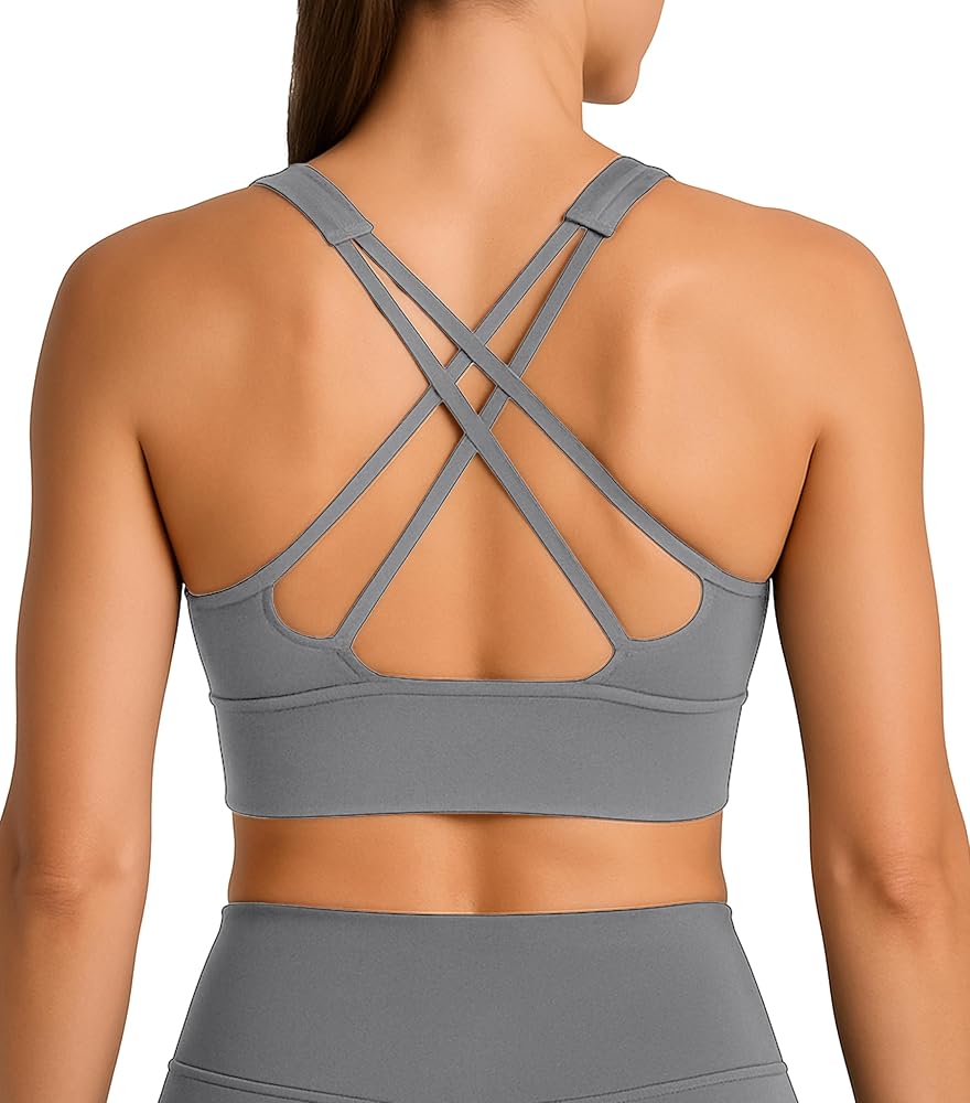 • Criss Cross Back Straps Design: يتميز بتصميم حمالة صدر رياضية متقطعة مع أحزمة متقاطعة قابلة للتعديل ، مما يضمن ملاءمة مريحة تظل في مكانها أثناء جلسات التمرين مثل اليوغا أو الجري