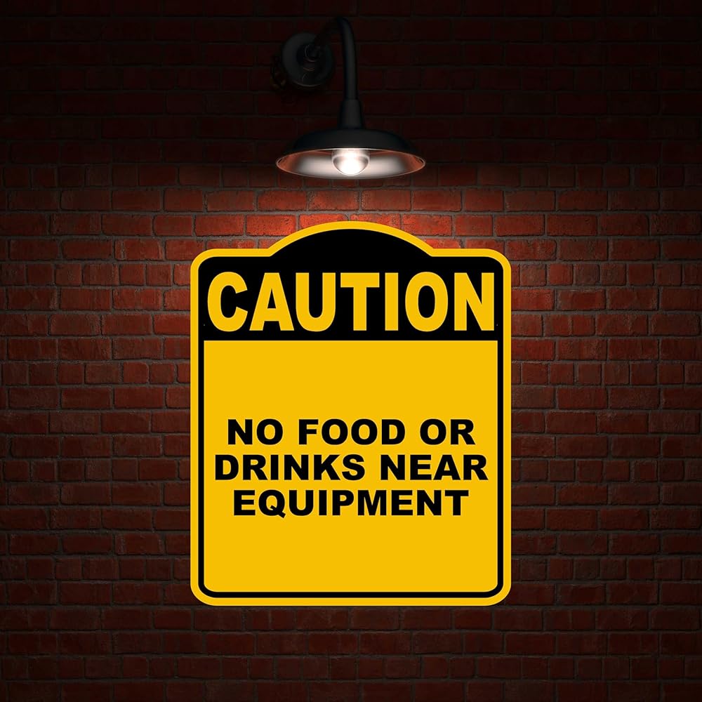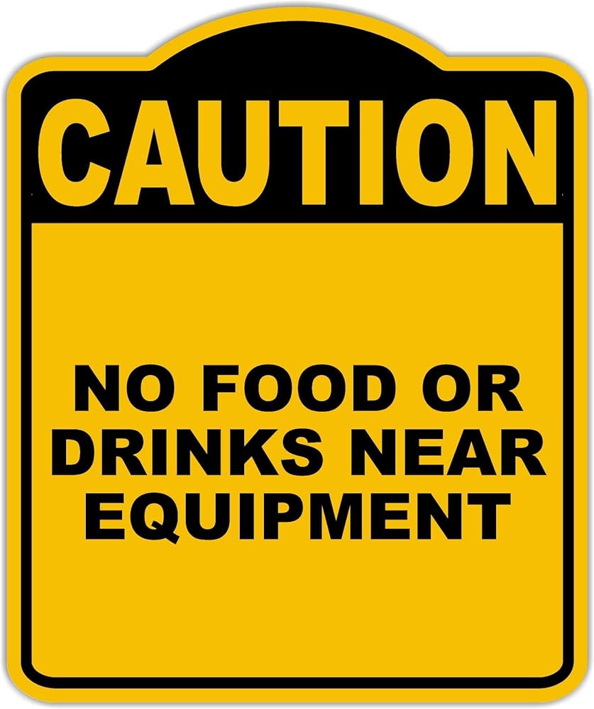 لا طعام أو مشروبات بالقرب من المعدات تحذير أصفر أسود الألومنيوم المركب 8.5 × 10 بوصات