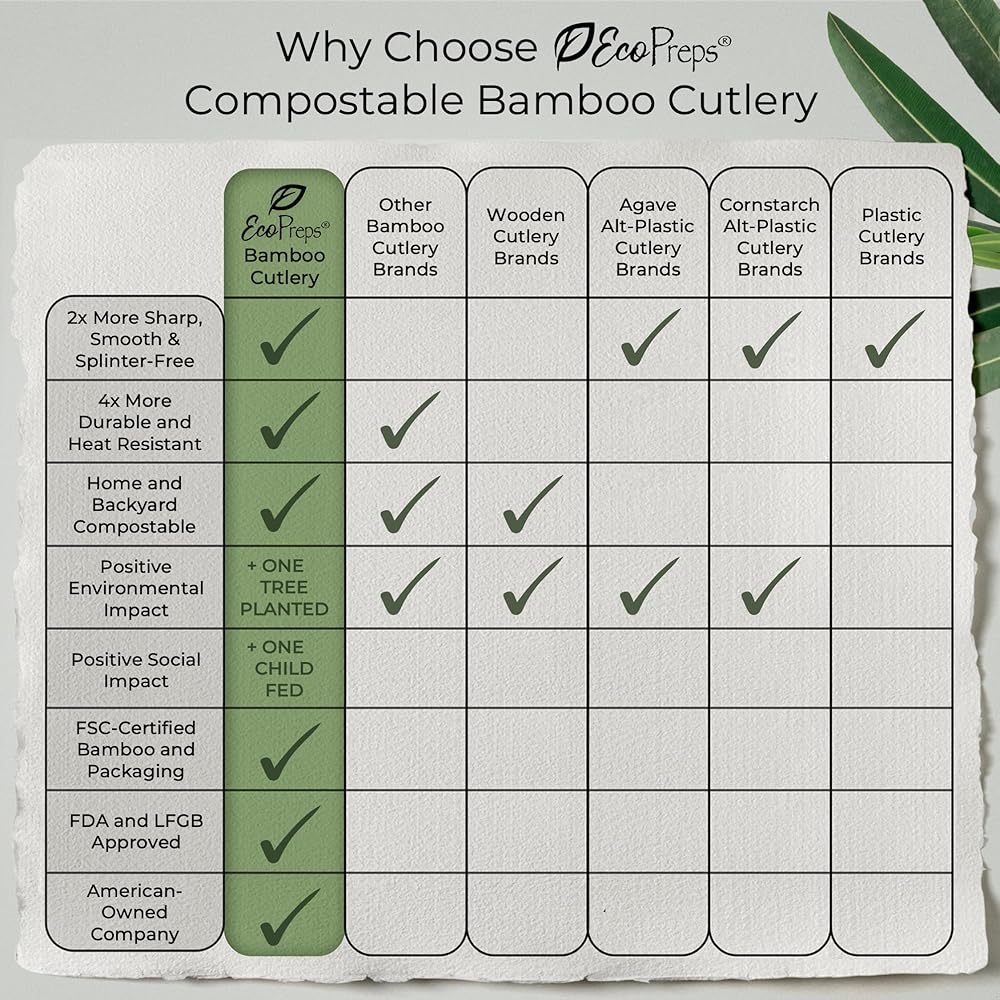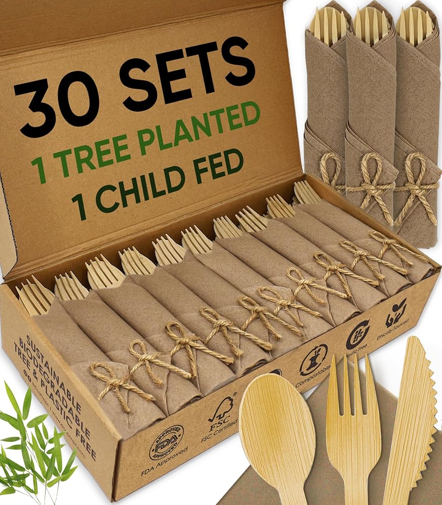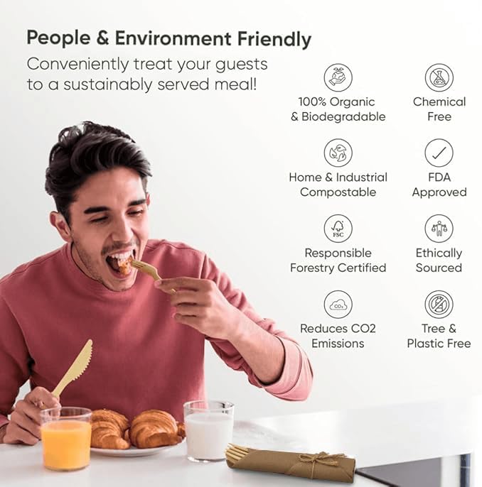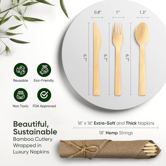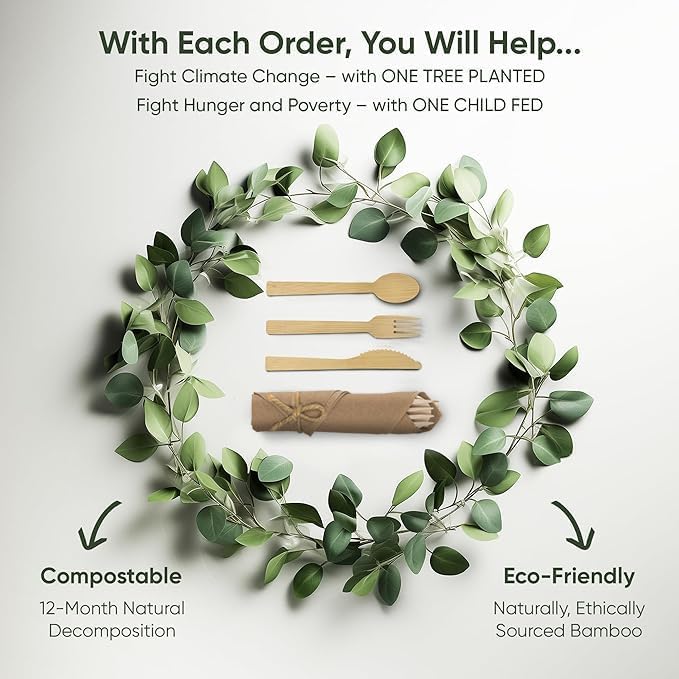 يمكن التخلص منها ، ولكن مستدامة: على عكس أدوات المائدة البلاستيكية ، فإن أدوات المائدة الخيزران التي يمكن التخلص منها قابلة للتحلل بالكامل ولن تجلس في مدافن النفايات لسنوات. نستخدم العبوة المعتمدة من FSC ونزرع شجرة / تغذية طفل بكل طلب-كل ذلك لكوكب أفضل.