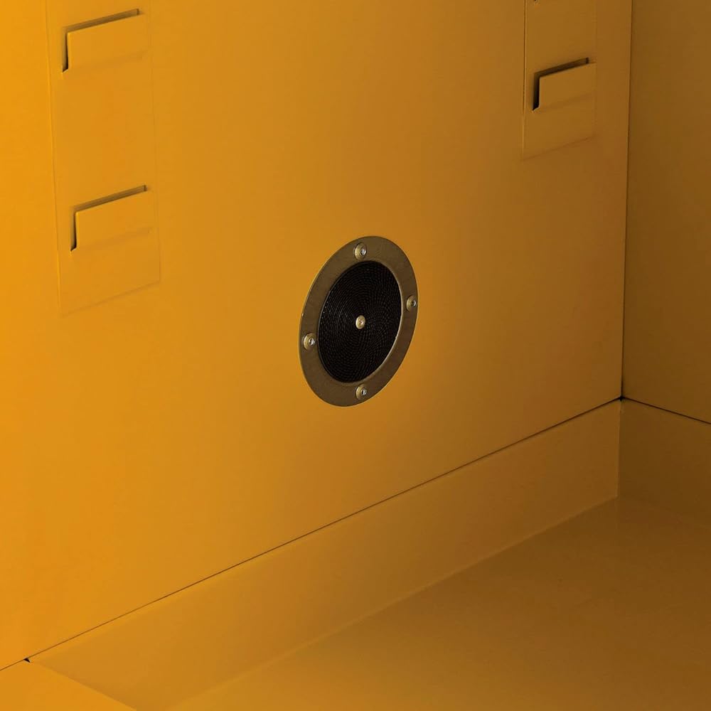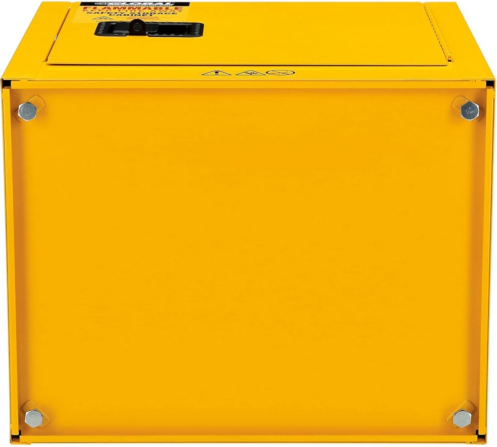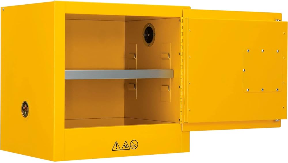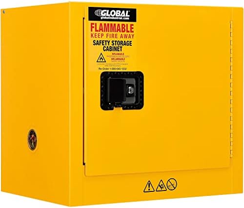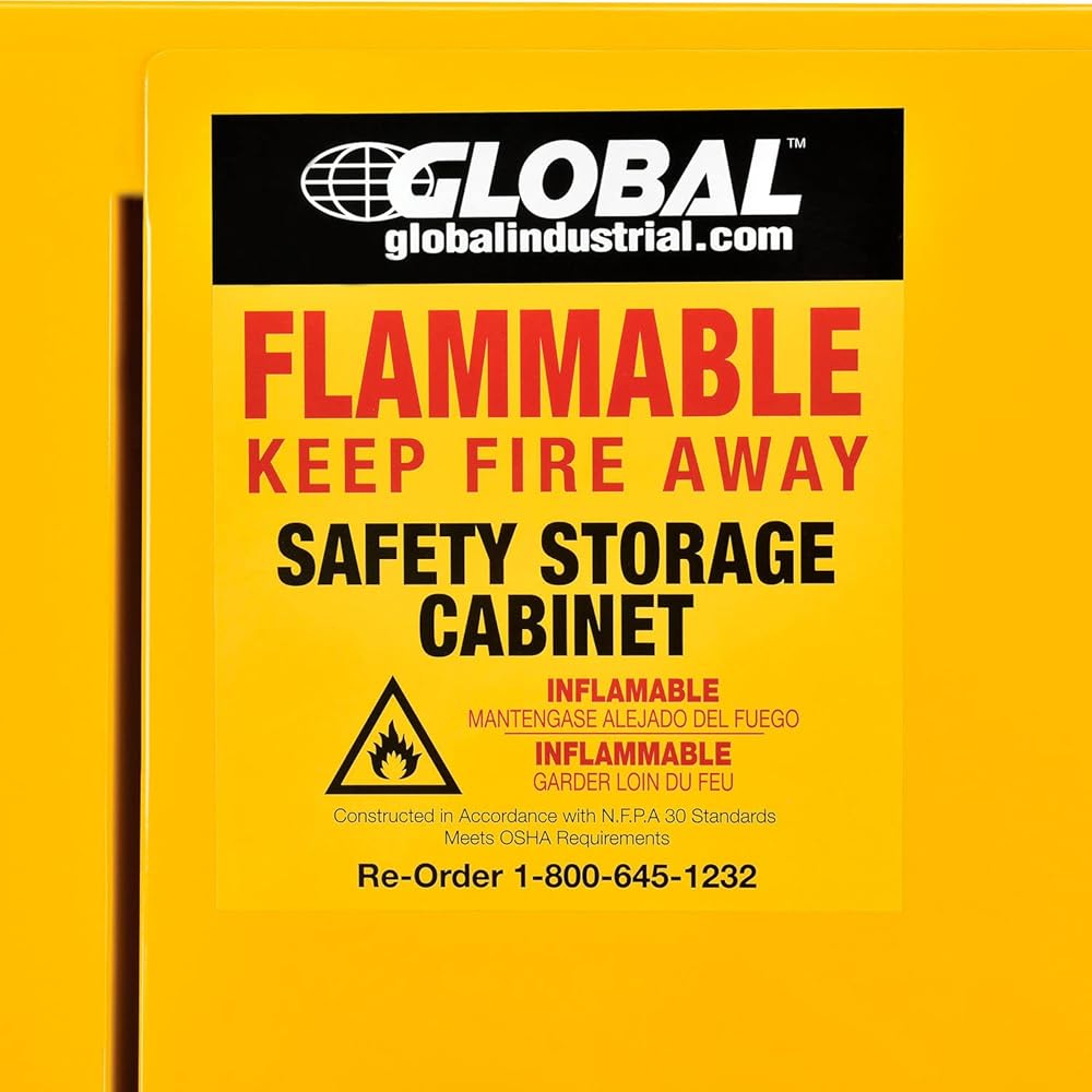 For securable and supreme level flammable storage management at facilities, businesses, and other commercial establishments, the Global Industrial Flammable Storage Cabinet is your solution for securely containing sensitive items and similar supplies in need of flame protection. This standalone, single door cabinet is compact in design to occupy minimal space, making it suitable for any hallway, warehouse room or commercial interior. Built to withstand a storage capacity of 6 gallons. Cabinet door must be closed manually. Rigid heavy duty construction is cost effective and assures lasting durability. Fully assembled and solidly built. Bright yellow color finish with Flammable - Keep Fire Away label. 1 Year Limited Warranty. Some state and municipalities may require self-closing doors on flammable safety cabinets. This cabinet has manual closing doors, please review your local ordinances prior to purchasing., Lot of 1