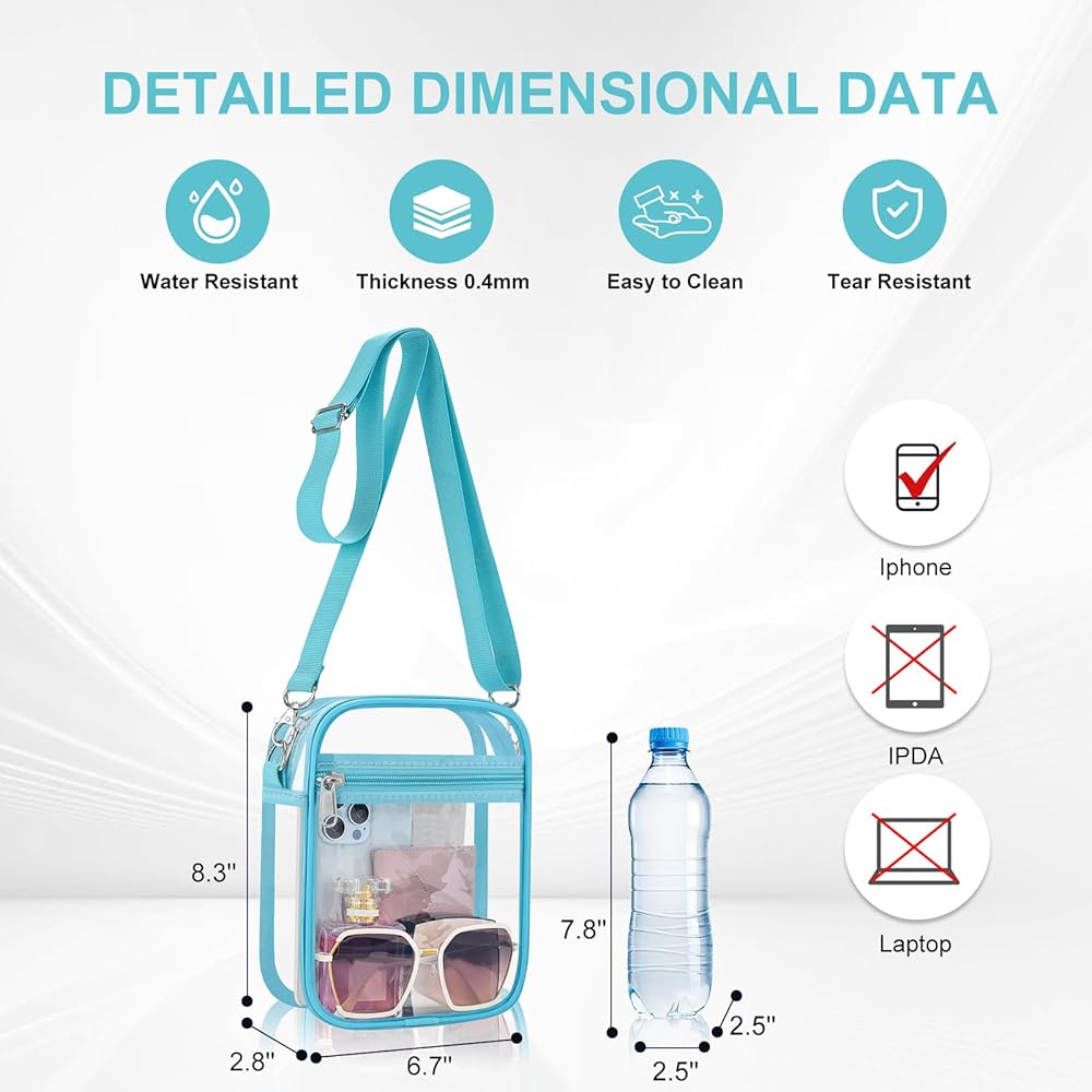 حقيبة واضحة لأحداث الاستاد: تتقيأ 8.3 "H x 6.6" L x 2.8 "W ، وهو أصغر من معيار سياسة الأكياس الصافية البالغ 12" × 12 "× 6" ، وبالتالي تلبي متطلبات الملاعب والحفلات الموسيقية والأحداث الرياضية.