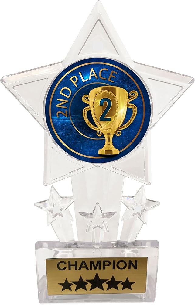 1 Pack of 6.5 Inch Tall Star Shaped Clear Acrylic Champion 2nd Place Award Trophies. Each Trophy Includes an Attached Full Color Second Place Logo Insert, and Attached Gold Color Laser Engraved Plate with the Black Text Champion and a Set of Stars. * Express Medals awards, medals, trophies, plaques, rings and championship belts are designed to make your events, tournaments and celebrations a huge success.