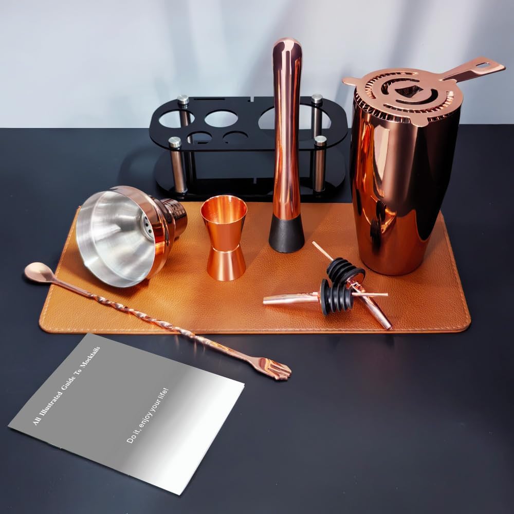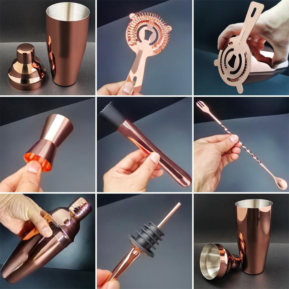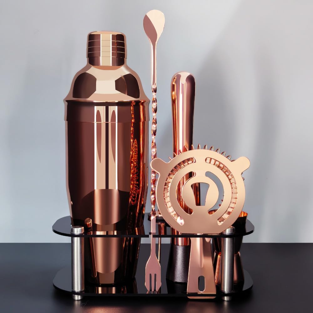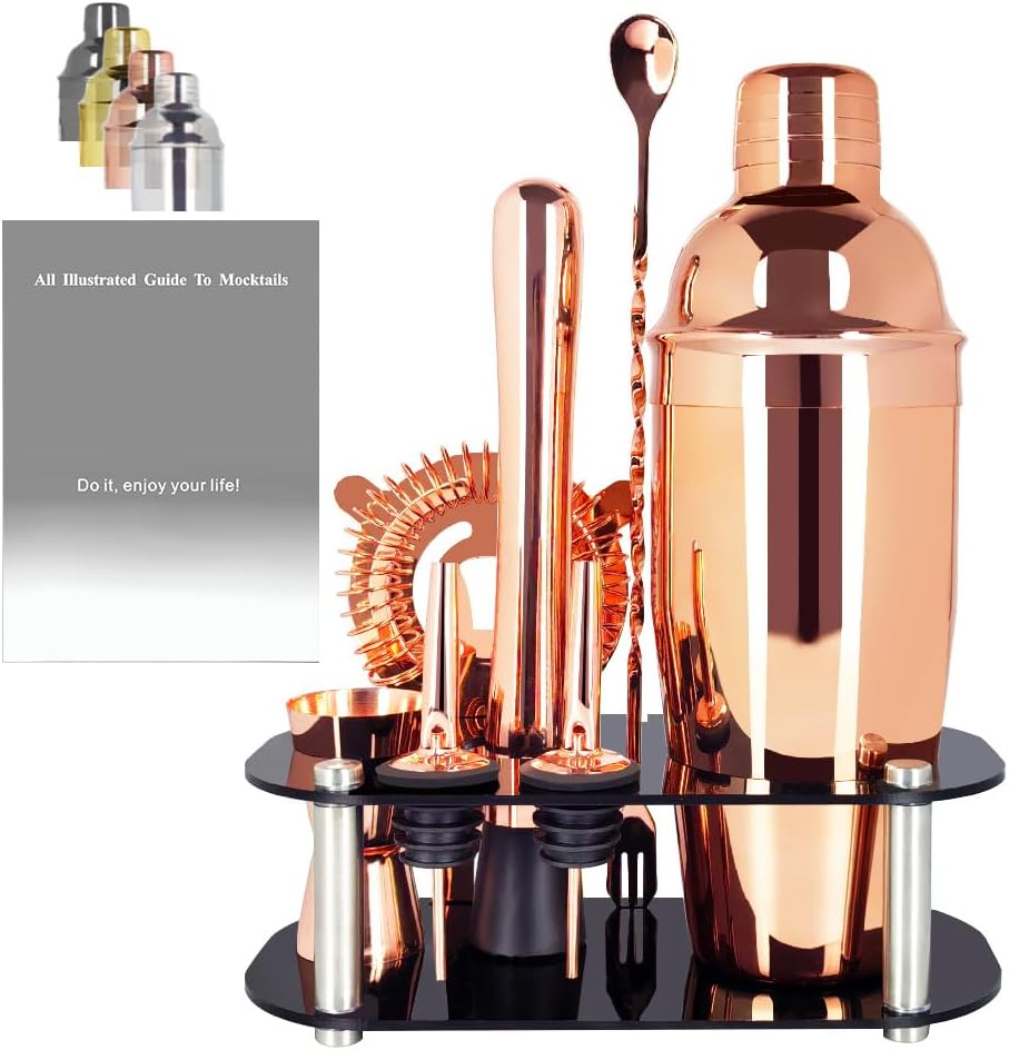 Elevate your bartending skills with this premium cocktail shaker set, designed to make every drink a masterpiece. The sleek and stylish stainless steel construction ensures durability and easy cleaning, while the 25oz (750ml) shaker capacity allows you to craft cocktails for multiple guests. This comprehensive set includes all the essential tools: a strainer, jigger, bar spoon, muddler, pourer, and bottle stopper, neatly organized on a clear acrylic stand for convenient access. Whether you're hosting a party or enjoying a night in, this cocktail shaker set will impress with its professional-grade quality and functionality. Upgrade your home bar and let your mixology talents shine.