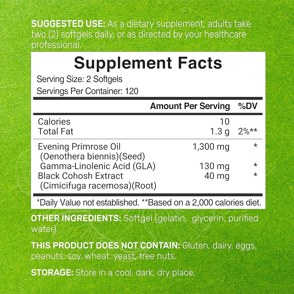 الجرعة والوجبات - تحتوي كل زجاجة على 240 كبسولة هلامية صغيرة، 2 كبسولة هلامية بحجم الجرعة، تحتوي على 1300 مجم من زيت زهرة الربيع المسائية من بذور إينوثيرا بينيس الأصلية، و130 مجم من حمض GLA الطبيعي، و40 مجم من مستخلص جذر الكوهوش الأسود من cimicifuga Racemosa مع كل جرعة، ويدوم حتى 120 ملجم. أيام.