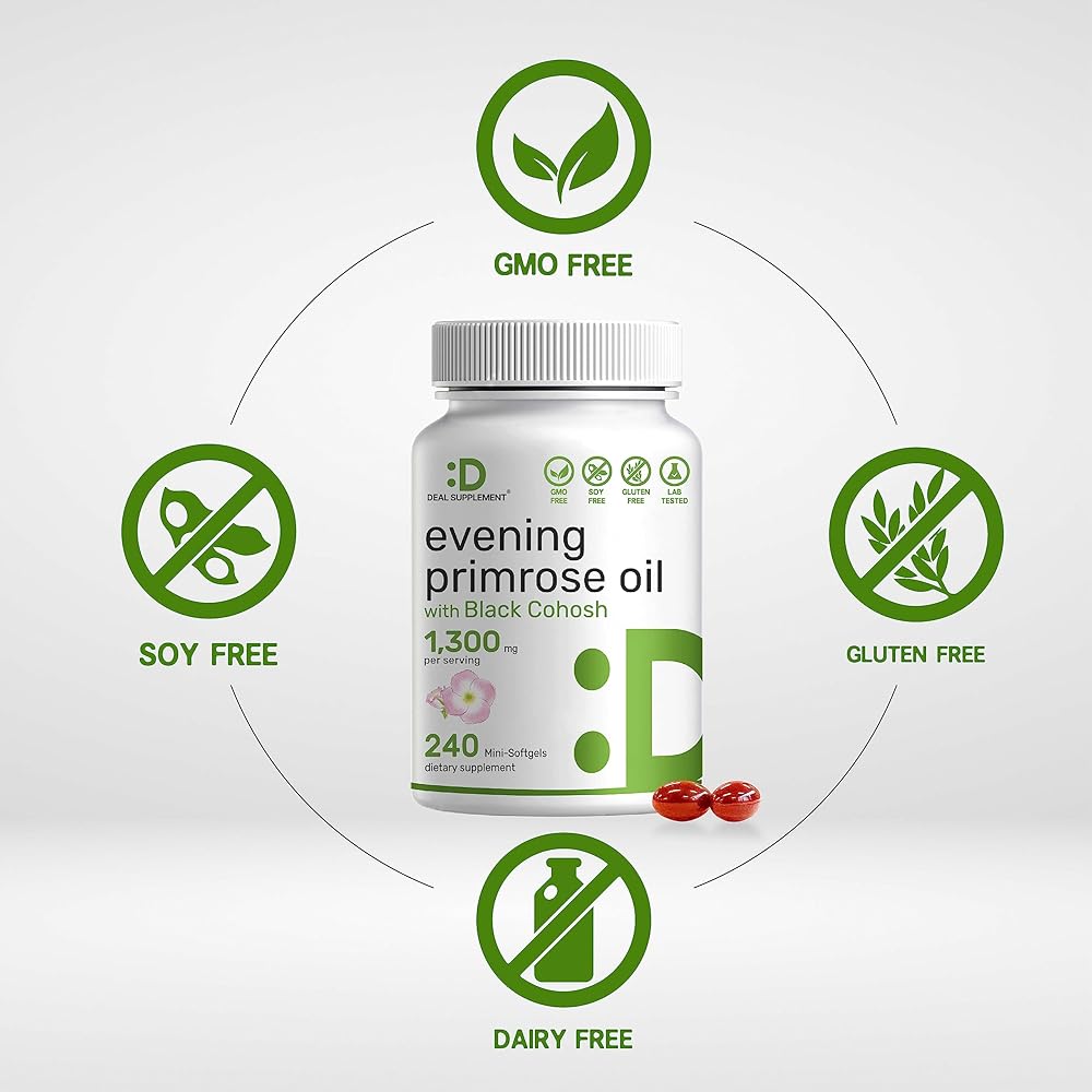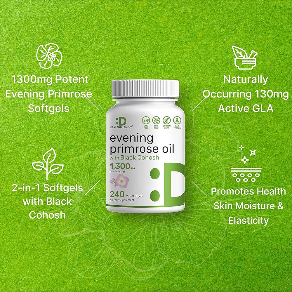 ميزات خاصة - مكمل زيت زهرة الربيع المسائية 2 في 1 عالي الفعالية، كبسولات هلامية سائلة مشتقة من بذور زهرة الربيع المضغوطة على البارد وموحدة بنسبة 10% من GLA النشط، معززة بمستخلص جذر الكوهوش الأسود لتحقيق أقصى قدر من الفوائد.