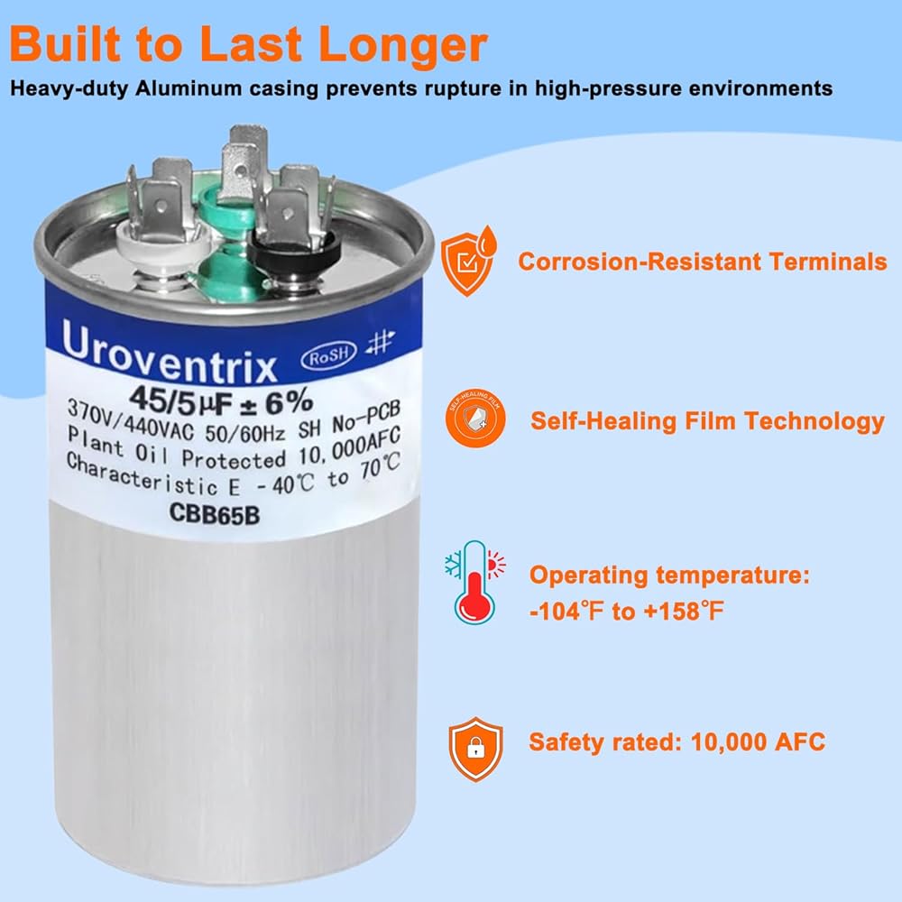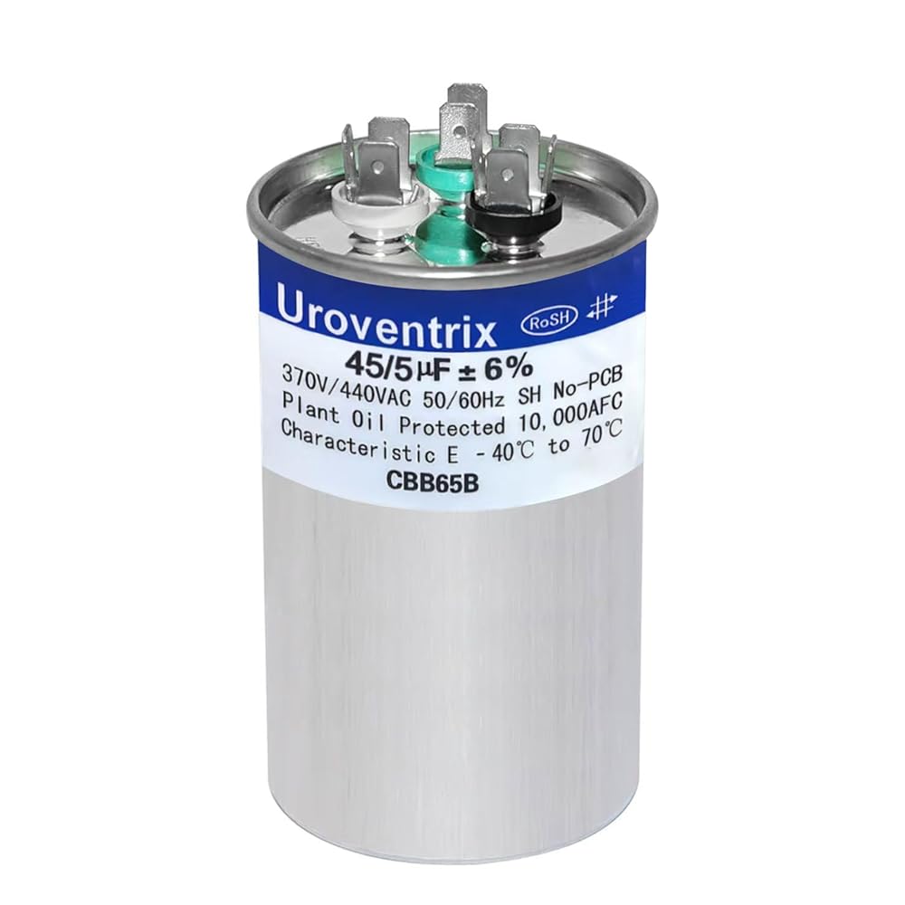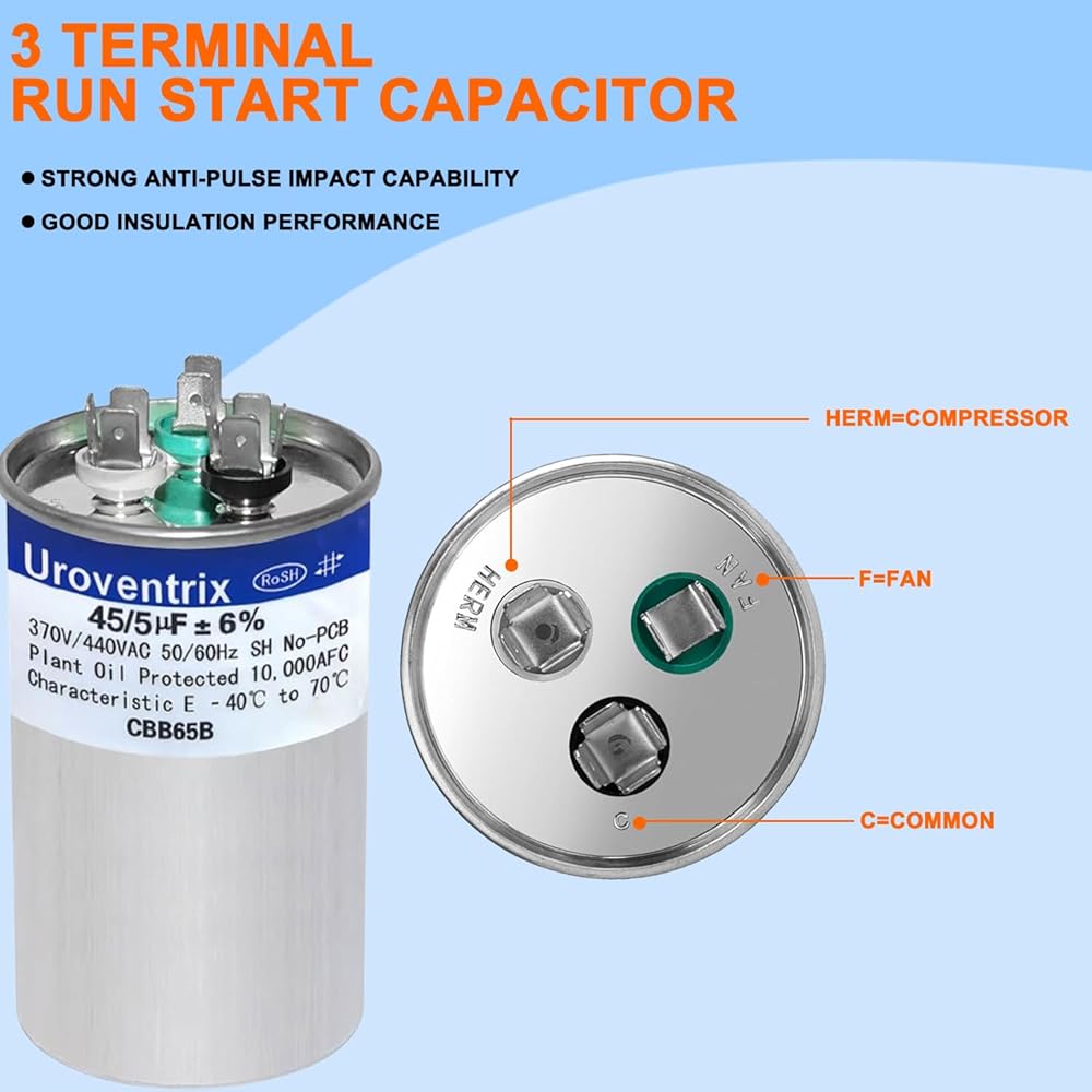 45+5 μF ±5% 370V/440VAC CBB65 dual run start capacitor, operates at 50/60Hz, compatible with 370V & 440V systems for AC motors, heat pumps, and condenser fans.