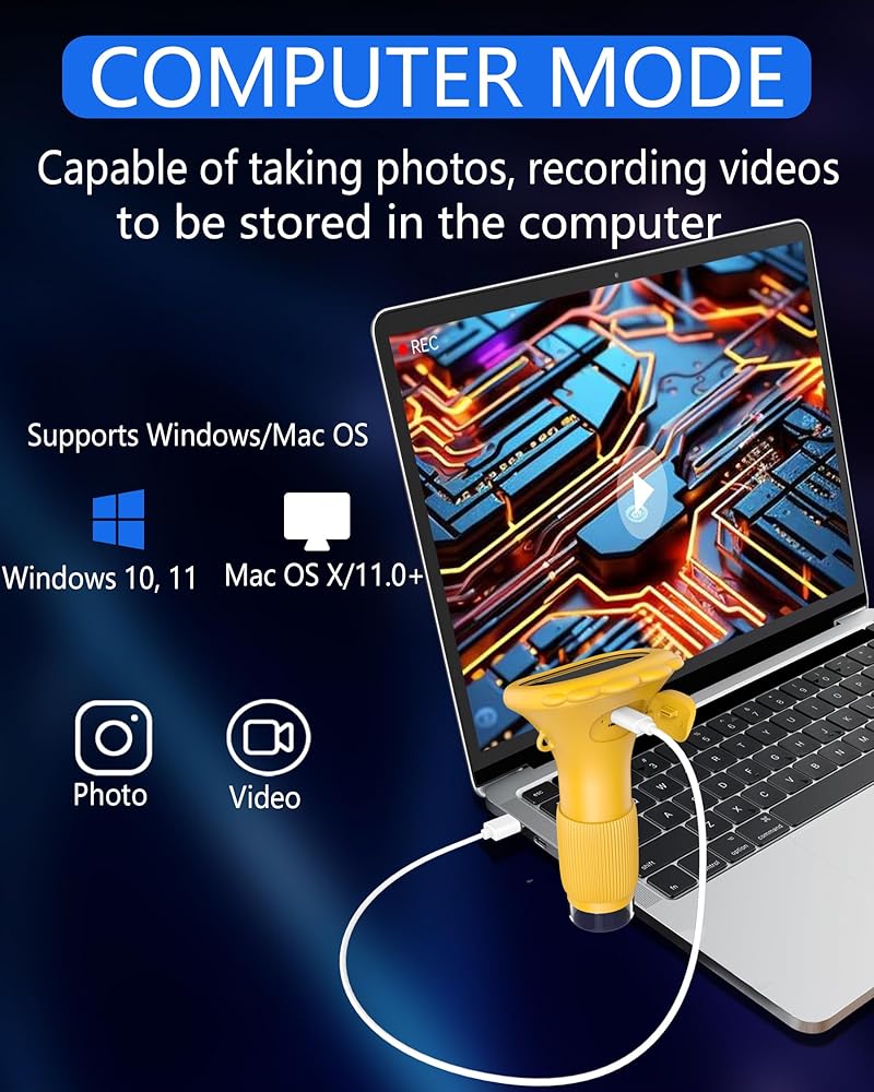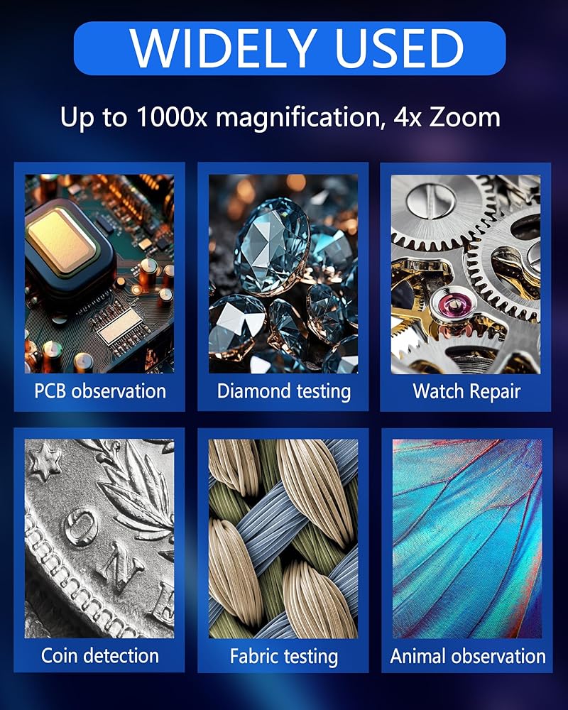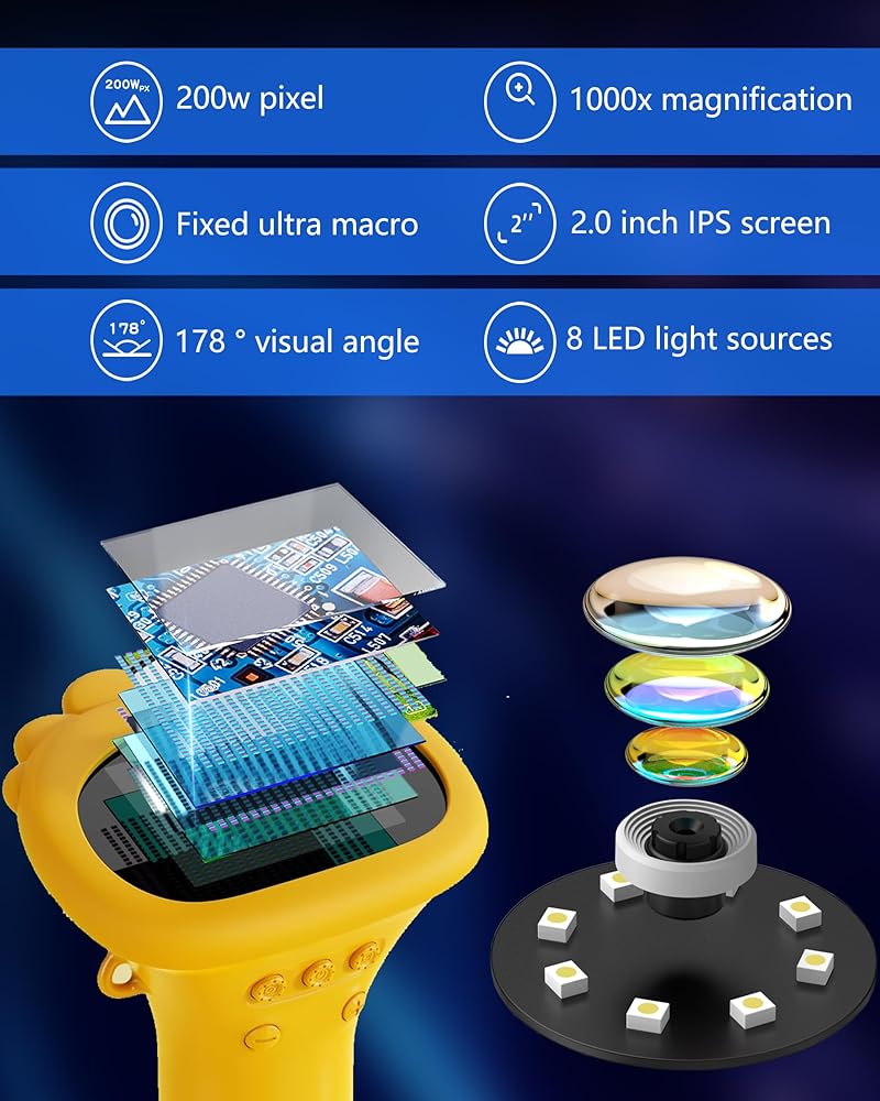 وضع التركيز: يتميز المجهر الإلكتروني بما يصل إلى 1000x تضخم ثابت ومقبض ضبط التكبير الرقمي 4x. ما عليك سوى وضع المجهر مباشرة على الكائن للحصول على عرض واضح وموسع. نصيحة: احتفظ بالأشياء مسطحة وتجنب لمس العدسة لضمان صور واضحة.