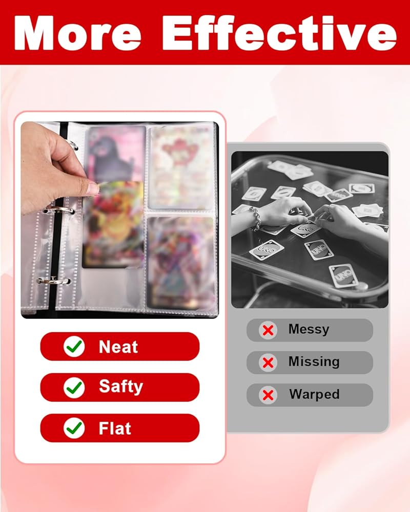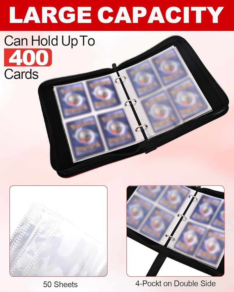 Massive 400‑Card Capacity: Our 4‑pocket cardguard binder includes 50 sheets to hold up to 400 cards, giving collectors ample room to sort sets by theme or rarity. Stay organized and find your favorite cards in seconds—at home or else