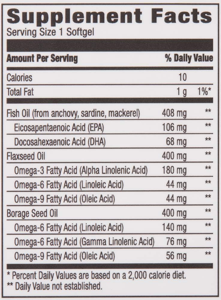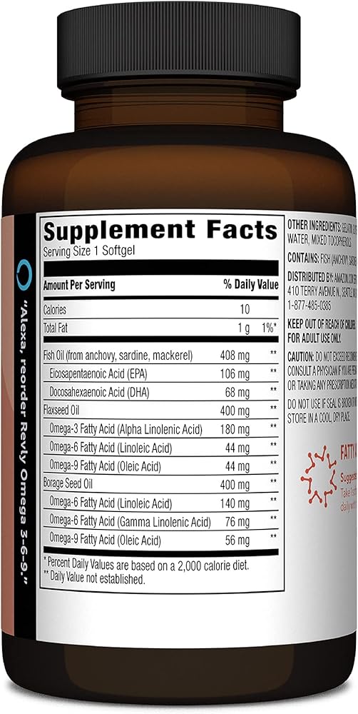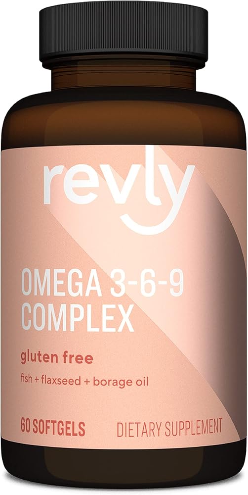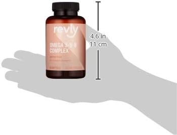 كبسولات Revly Omega 3-6-9 المركبة خالية من الغلوتين، وتحتوي كل جرعة على 408 مجم من زيت السمك، و400 مجم من زيت بذور الكتان، و400 مجم من زيت بذور لسان الثور.