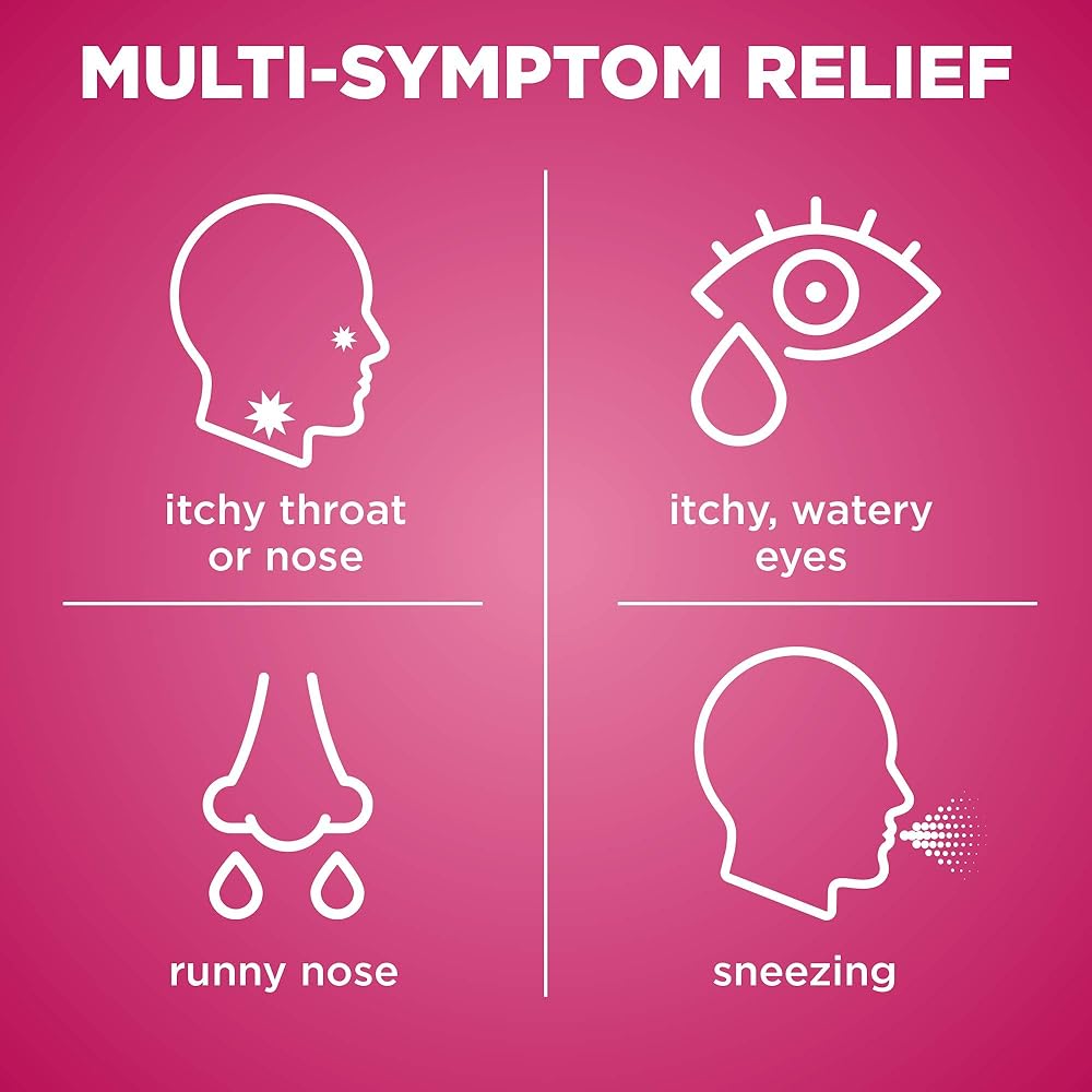 تخفيف الحساسية متعدد الأعراض: يوفر راحة مؤقتة متعددة الأعراض من العطس وسيلان الأنف وحكة الأنف أو الحلق وحكة العيون المائية.