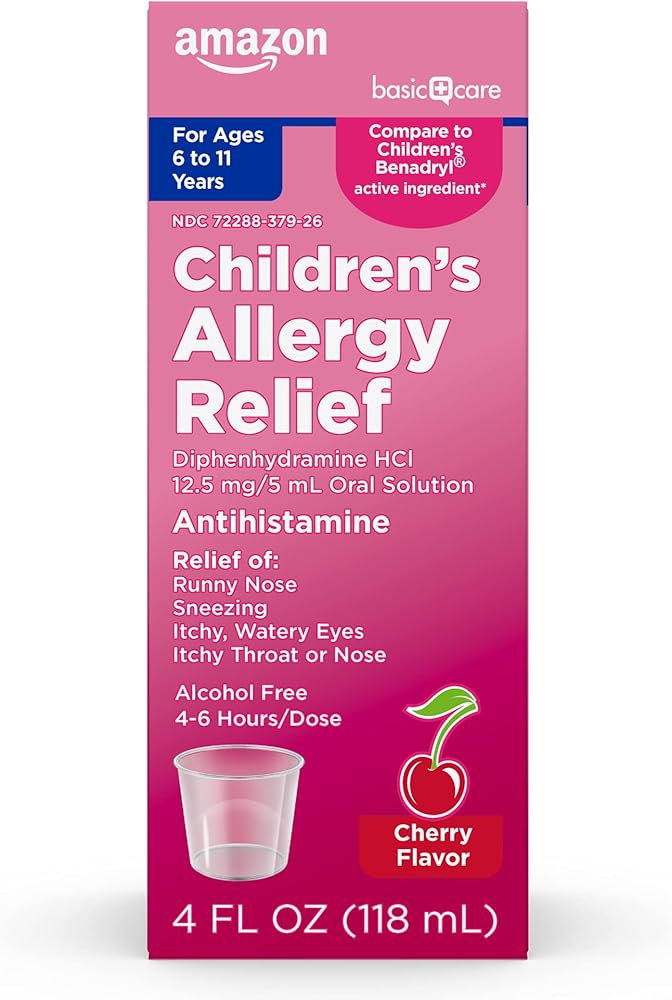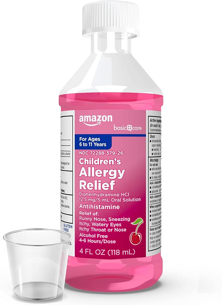 المكون النشط: يحتوي منتج أمازون بيسك كير لحساسية الأطفال على ديفينهيدرامين هيدروكلورايد 12.5 مجم/5 مل، وهو مضاد للهستامين، مقارنة بالعنصر النشط في سائل بينادريل للحساسية للأطفال.