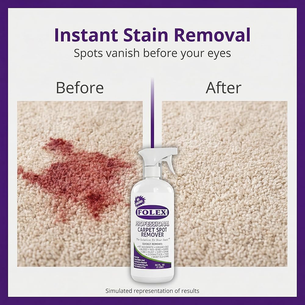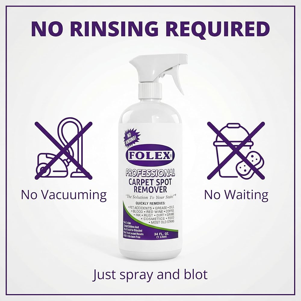 If you are looking for a professional quality spot cleaner to remove stains fast, then you will love our FOLEX Professional Carpet Spot Remover! It works on pet accidents, grease, ink, red wine, coffee, blood, rust, food, cosmetics, dirt, grime, and even old stains! FOLEX Professional carpet cleaner solution has helped thousands of customers remove stains for over 50 years! It contains no solvents, and its non-flammable, odor-free, petroleum-free, with no VOCs or CFCs. It is water-based and leaves no soapy residues. It is safe to use around children and pets if used as directed. Plus, it is non-ionic so it will not attract dust or dirt back to the cleaned area. This professional formula can be used on any carpet or material that will not be damaged by water. This FOLEX Professional Carpet Stain Remover can be used as a couch sofa cleaner, a car carpet cleaner, a laundry stain remover spray, a spot cleaner for carpet and upholstery, a car fabric seat cleaner for stains, a rug cleaner, a carpet spot cleaner, a fabric cleaner for furniture upholstery, a carpet stain remover for old stains, and more! You should always test a hidden area of the carpet or material to be cleaned for color fastness and color stability prior to use, follow the directions for use on the bottle. For best results apply a generous amount on the spot, gently agitate, and then blot with a clean absorbent cloth. No rinsing, vacuuming, or waiting to see results with the amazing surfactant action! Just allow carpet or material to dry before use. If you have a lot of tough stains to remove on a daily basis, then you will love the ergonomics of the 34oz FOLEX Professional Carpet Spot Remover spray bottle! Click the yellow “Add to Cart” button today to enjoy life without the stress of stains!