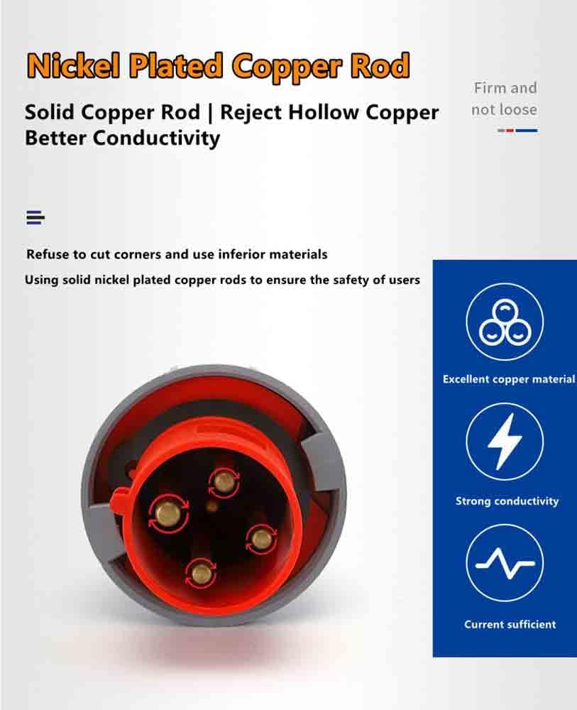 Number of Positions3Pin(2P+E) / 4Pin(3P+E) / 5Pin(3P+E+N)GenderMale / FemaleOrientationStraight / Right AngleShell MaterialNylon + PA66Contacts MaterialNickel Plated Brass BrassRated Current16A / 32A / 63A / 125ARated Voltage110V-130V / 220V-250V / 380V-415V / 500VFrequency50/60HZGrounding4H / 6H / 7H / 9HTemperature Range-25°C ~ + 80°CIP RatingIP44 / IP67ColorYellow / Blue / Red CEE Industrial Connector