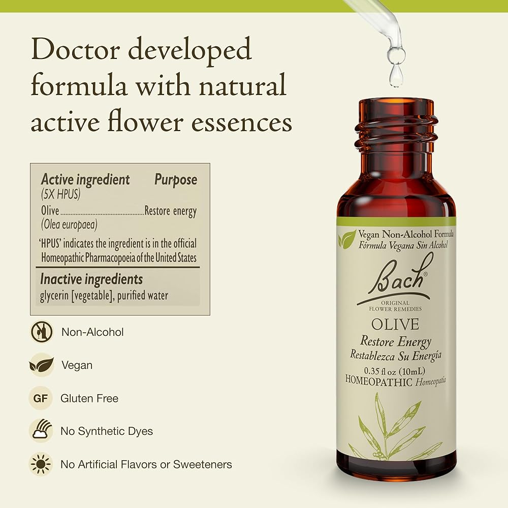 استعيدي الطاقة مع زيتون باخ. يشجع علاج BACH Olive الإمكانات الإيجابية لتنشيط نفسك بعد بذل الجهد. في الأوقات التي نفدت فيها جميع احتياطيات القوة الداخلية والطاقة. اتركها واسمح لنفسك بتنشيط واستعادة طاقتك العقلية.