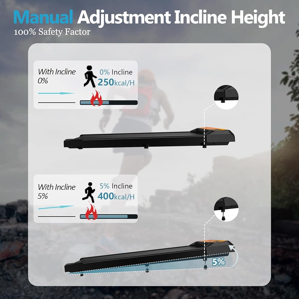 【بنسبة 5 ٪ من طاحونة المنحدر للمنزل】 cyclerade undermillls under-desk لها أحدث ميزة الانحدار بنسبة 5 ٪ ، والتي تؤدي إلى حرق 3 مرات من السعرات الحرارية. تتيح لك هذه الميزة من حلقة المشي في حصيرة المشي الاستمتاع بالتنزه والتسلق في المنزل حتى في أيام الأمطار أو الضبابية.