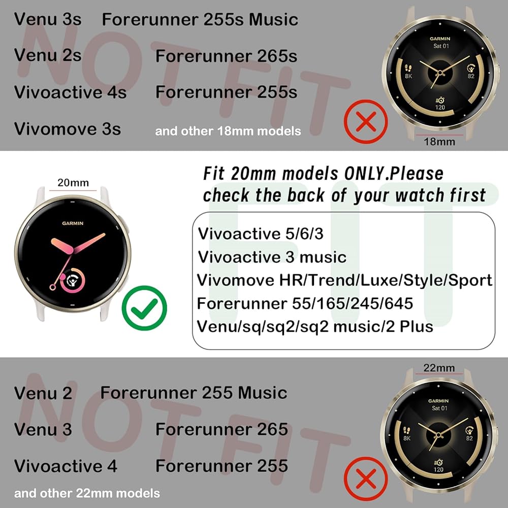 • 【النماذج المتوافقة】 هذا الخطاف الذي يبلغ طوله 20 ملمًا وحلقات نايلون ساعة متوافق مع Garmin Vivoactive 5/6/3/Forerunner 165/55/245/645/Venu SQ2/Venu (يرجى تأكيد نموذج الساعة قبل الشراء).