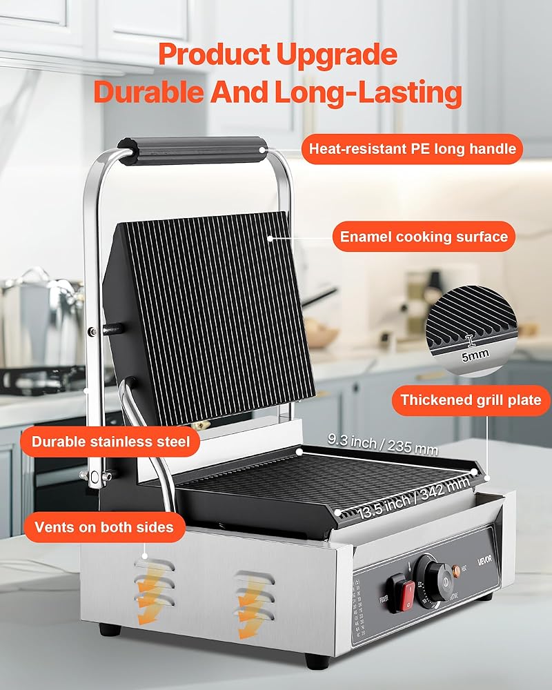 • متينة وطويلة الأمد: تتميز شواية بانيني التجارية هذه بخارجي من الفولاذ المقاوم للصدأ ولوحة شواء سميكة مع طلاء المينا. لن يسبب مقبض ABS الممتد حرقًا ، ويوفر القدمين غير المنقولة أمانًا إضافيًا