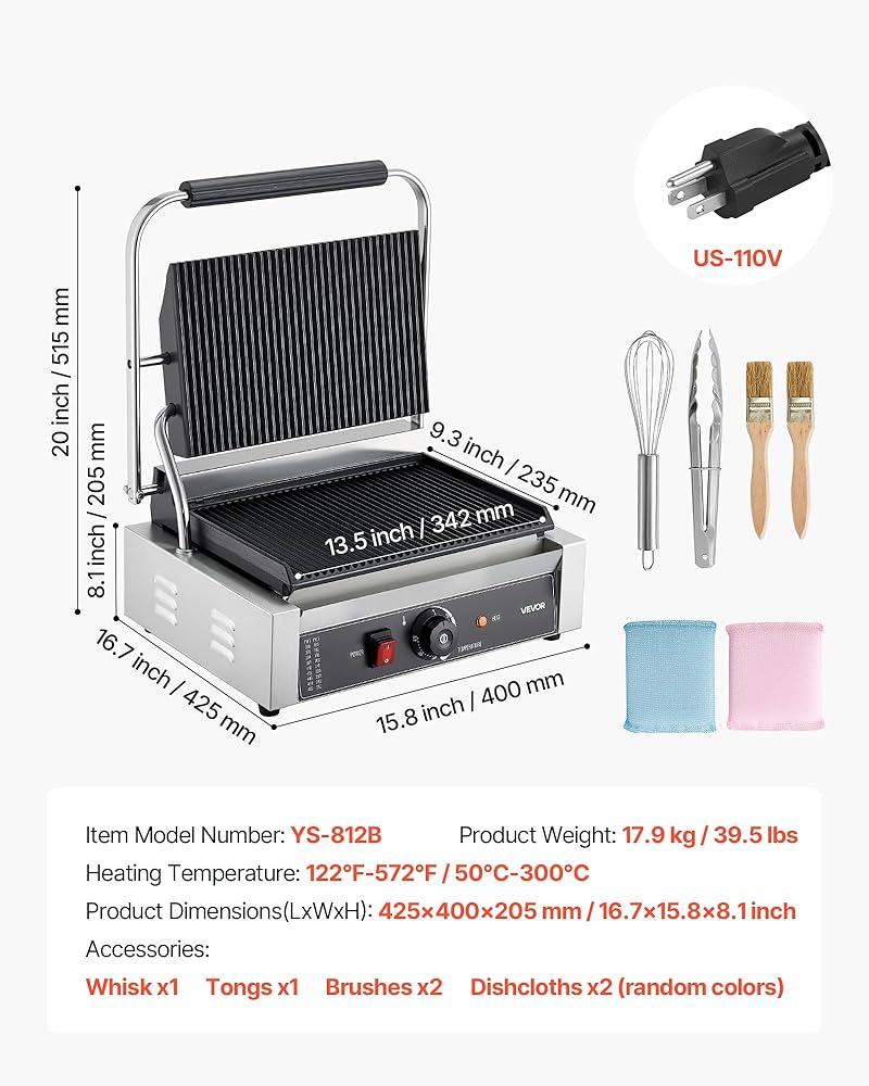 • سهل التنظيف: يأتي صانع ساندويتش Panini Press مع صينية زيت قابلة للإزالة لجمع النفايات والبقايا بسهولة. الصيانة بسيطة مع مكشطة وقماش جاف. تهتزات متعددة على كلا الجانبين تبدد الحرارة بشكل فعال