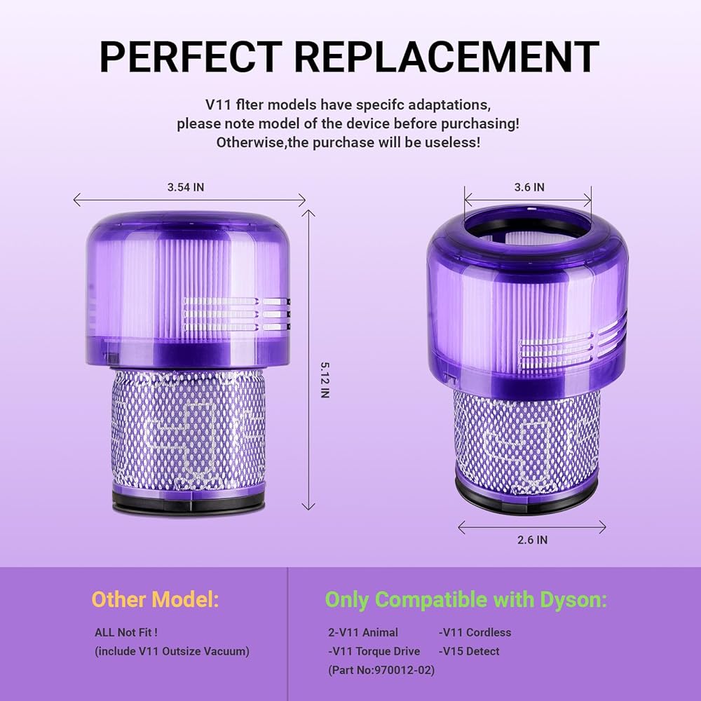 ---These filter replacements are NOT compatible with Dyson Gen5 Detect, Gen5 Outsize, V11 Outsize, V15 Outsize, Outsize Vacuum, Outsize+/Plus, Outsize Absolute+, SV19 Omni-glide +, V12 Slim, SV16, Micro 1.5KG, Cyclone V10 Animal, V10 Absolute, V10 Cyclone, V10 Total Clean, SV12 vacuums. Please confirm your accessories model and size before purchase