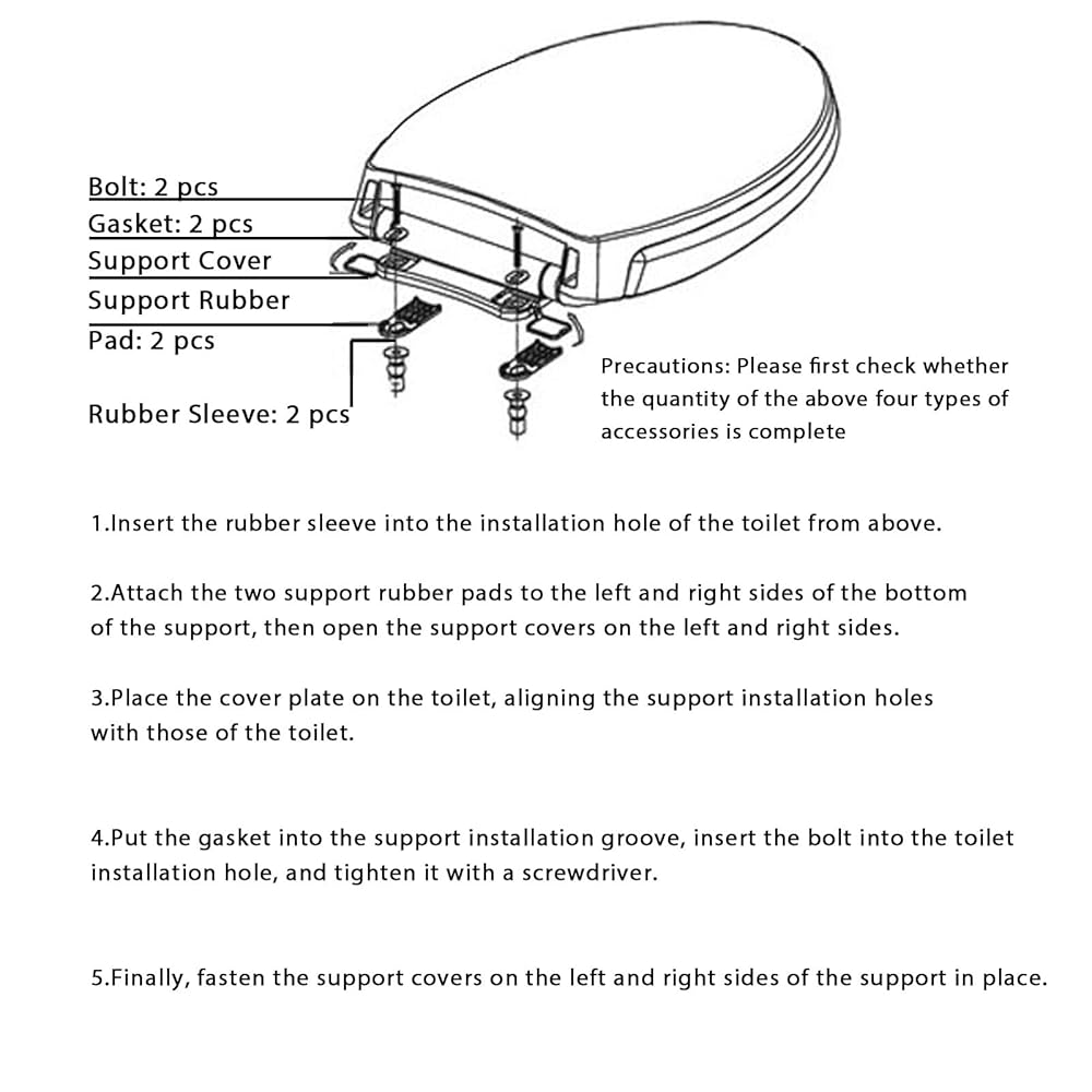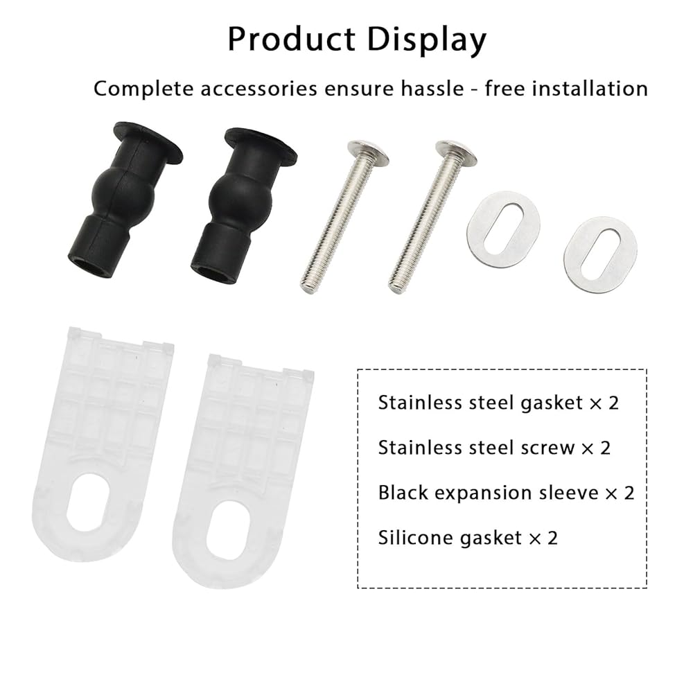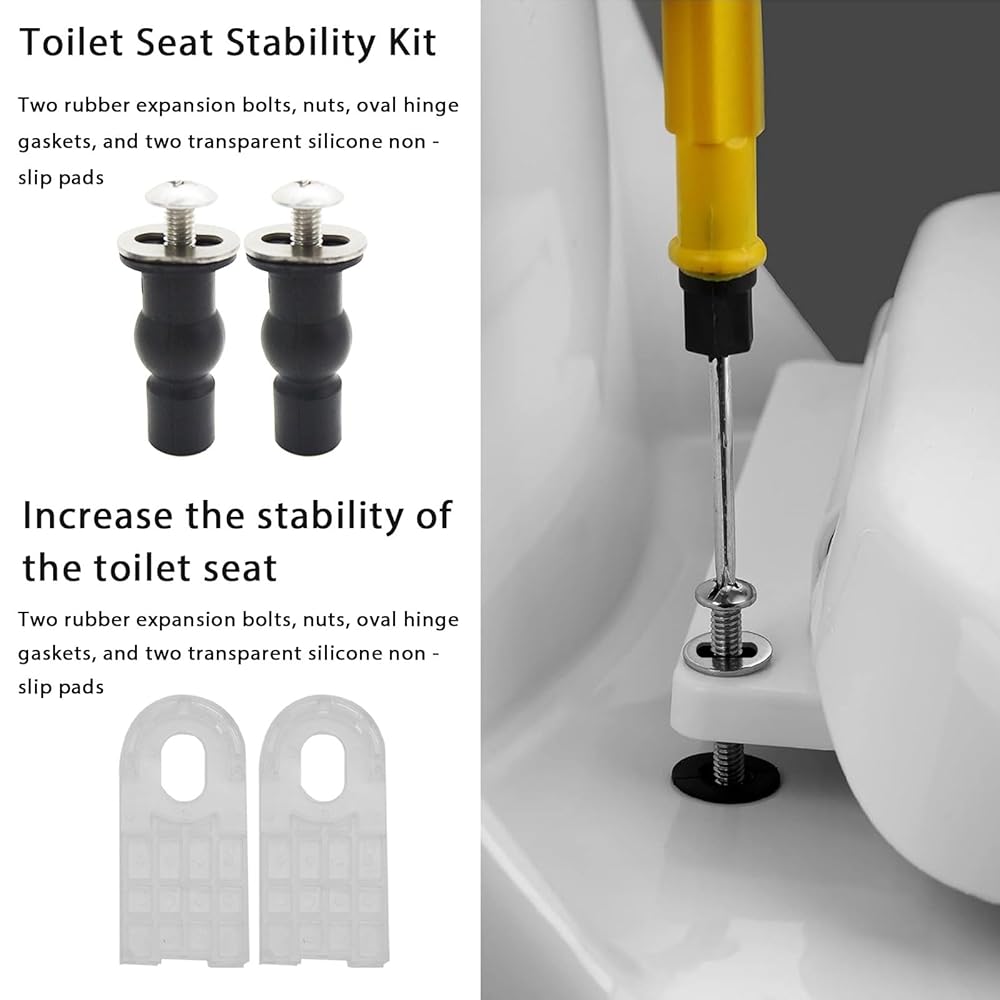 تشمل طقم تثبيت مقعد المرحاض المحسّن ، ويمنع تحويل مجموعة تثبيت مقعد المرحاض ، مسامير تمدد المطاط ، والمكسرات ، وغسالات المفصلات على شكل بيضاوي ، ووسادات تثبيت بلاستيكية شفافة لزيادة الاستقرار ، ومنع مقعد المرحاض من الانزلاق أو التحول أثناء الاستخدام. تم تصنيع صواميل تمدد المطاط مع النحاس الداخلي ، مما يوفر متانة أفضل مقارنة بمسامير معدنية منتظمة وضمان الاستخدام على المدى الطويل