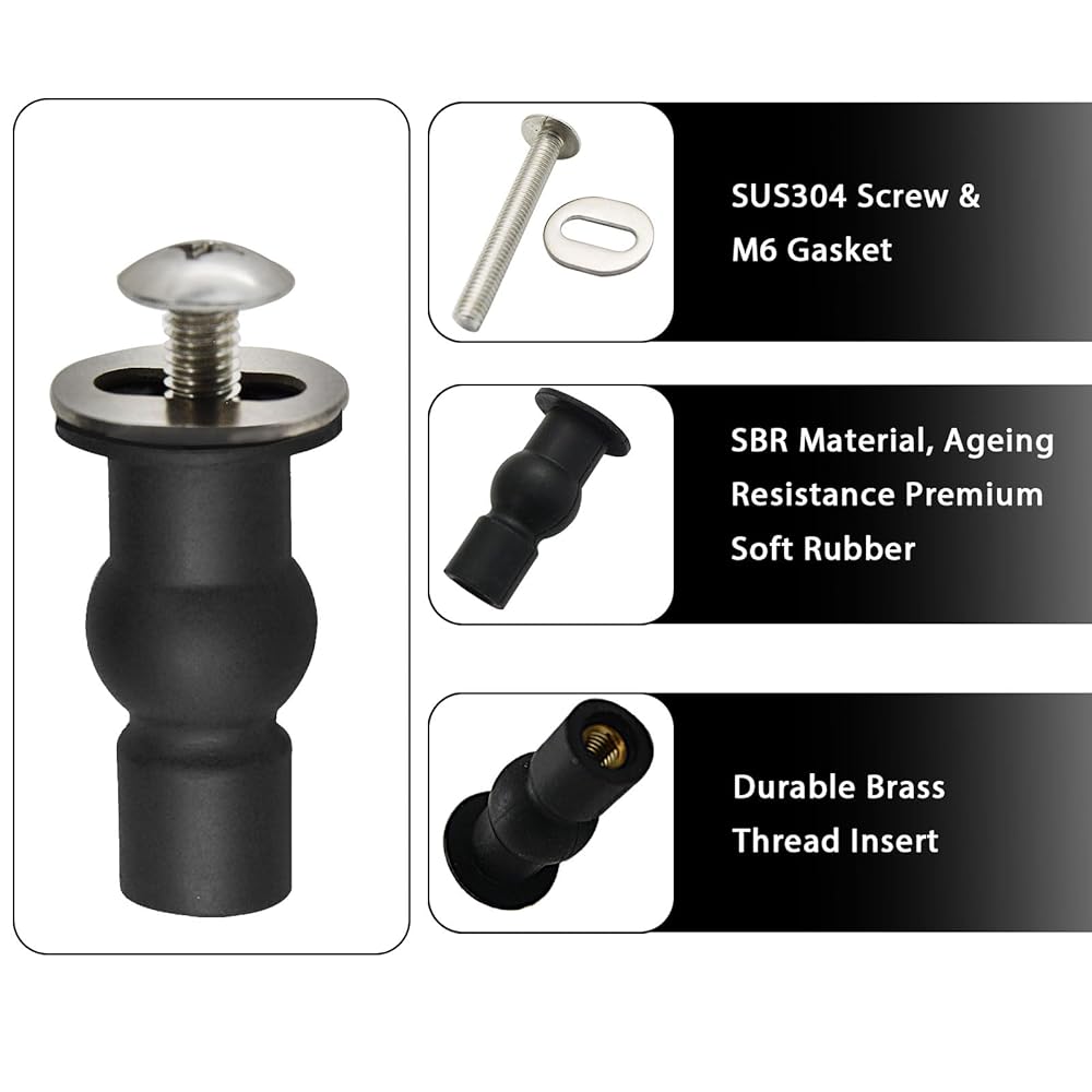 سهولة التثبيت ، لا يوجد تشديد أسفل المطلوب : براغي استبدال مقعد المرحاض ميزة المكسرات المطاطية ميزة مقاطع ملزمة ، بحيث يمكنك ببساطة إدخالها في الثقوب الموجودة على مقلاة المرحاض. شد المسمار سيوسع الجوز المطاطي ، ويؤمنه في مكانه دون الحاجة إلى الترباس على الطرف الآخر ، مما يجعل عملية التثبيت سريعة وخالية من المتاعب