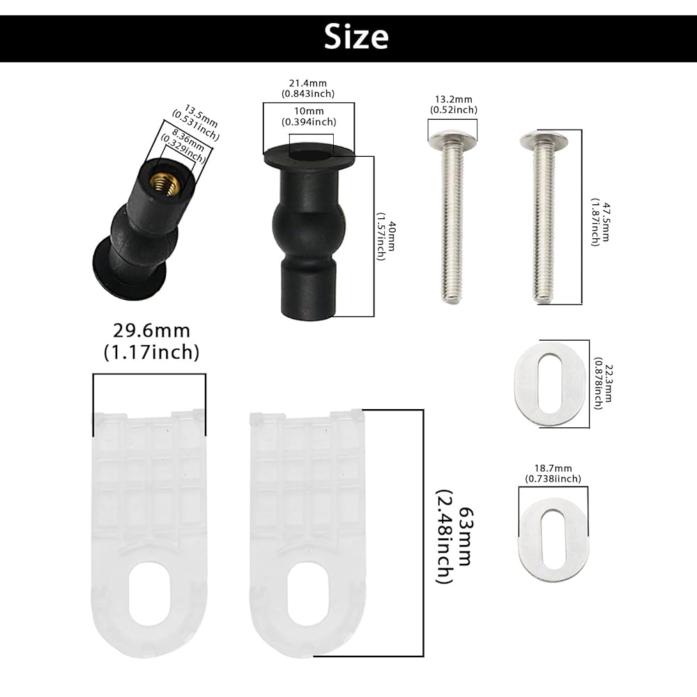 توافق واسع: يبلغ قطر كرة التمدد المطاطية من المسمار مقعد المرحاض 1.7 سم (0.67 بوصة) وطول 4 سم (1.57 بوصة) ، ومناسبة الثقوب بين 14-16 ملم. متوافق مع TOTO ، SS113/SS154/SS224/SS204 ، ومعظم مقاعد المرحاض القياسية. بديل مثالي لمفصلات مقعد المرحاض التالفة أو غير الوظيفي