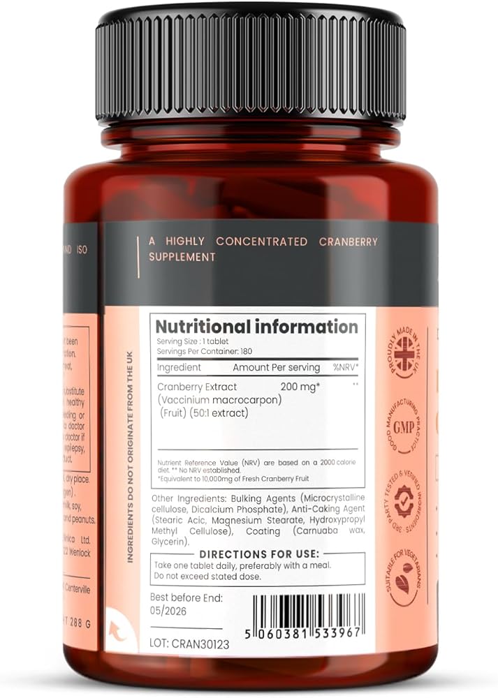 ALL THE GOODNESS OF CRANBERRY WITHOUT THE SUGAR – Cranberries have a very tart taste that for most people is unpalatable. To hide this taste most Cranberry products are loaded with added sugar which means that in terms of your health you are taking one step forward and two steps backward. With our concentrated tablets you can experience all of the benefits of Cranberry with zero sugar.
