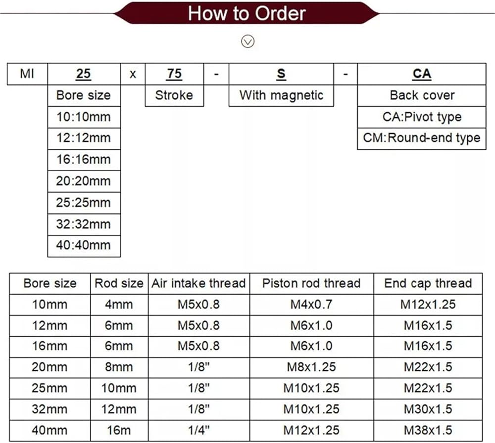 - 1pcs MI10/12/16/20/25-10*25X30X50X75-S-CA Small Stainless Steel mini Air Pneumatic Cylinder Double Acting