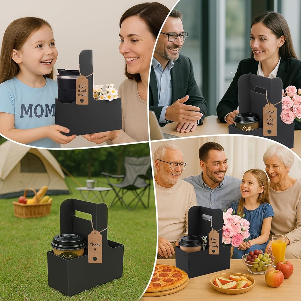 مجموعة واسعة من الاستخدامات: لا يقتصر حاملي فنجاننا فقط على حمل المشروبات ، ولكن أيضًا يحملون القهوة الساخنة أو المثلجة ، وعصائر ، وميلك شيك ، والآيس كريم ، وما إلى ذلك. يمكن استخدامها أيضًا كأكياس باقة ، والحلويات ، والكعك ، والهدايا الصغيرة ، ومنظمي مواد الطلاء ، والتي هي مناسبة جدًا للمقاهي ، ومتاجر الخبز ، ومحلات المتاجر ، ومطاعم.