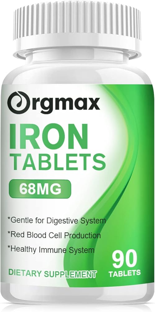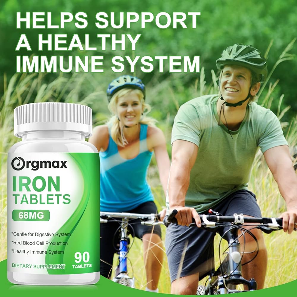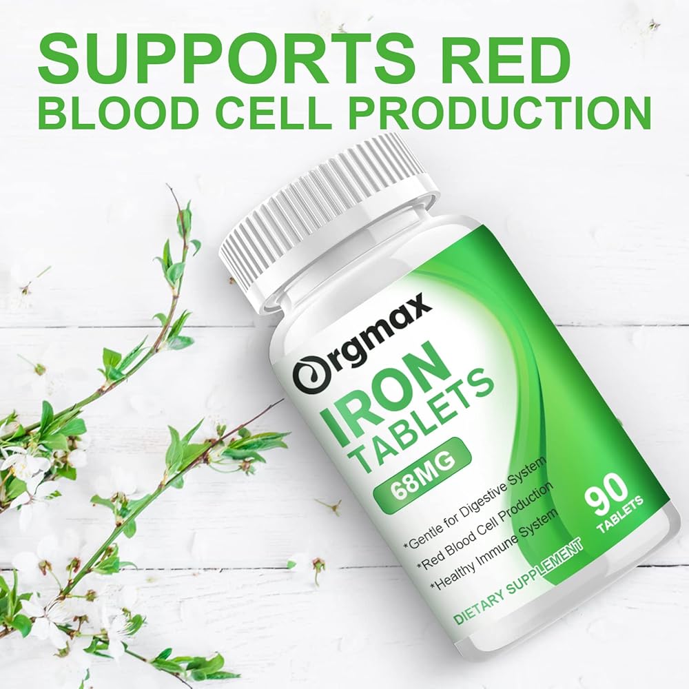 تحتوي على عبوة واحدة من مكملات الحديد عالية الفعالية ORGMAX بالإضافة إلى فيتامين C، 90 قرصًا، قطعتان يوميًا.