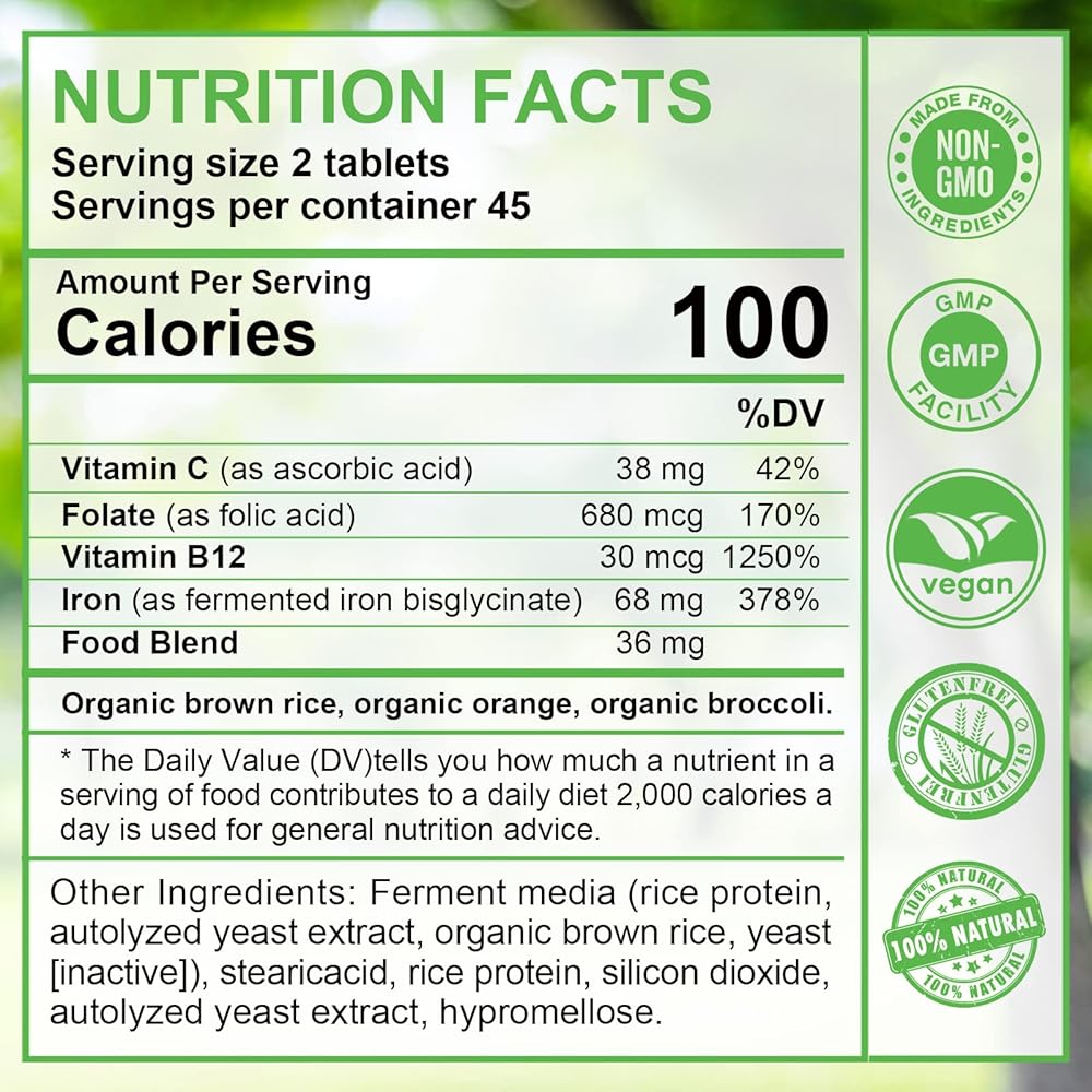 ORGMAX فيتامينات متعددة مع حديد 68 ملغ، مكمل حديد مع فيتامين C، B12 وحمض الفوليك، دعم الطاقة، إطلاق بطيء، فعالية عالية، لا غثيان أو إمساك، نباتي 90 قرصًا