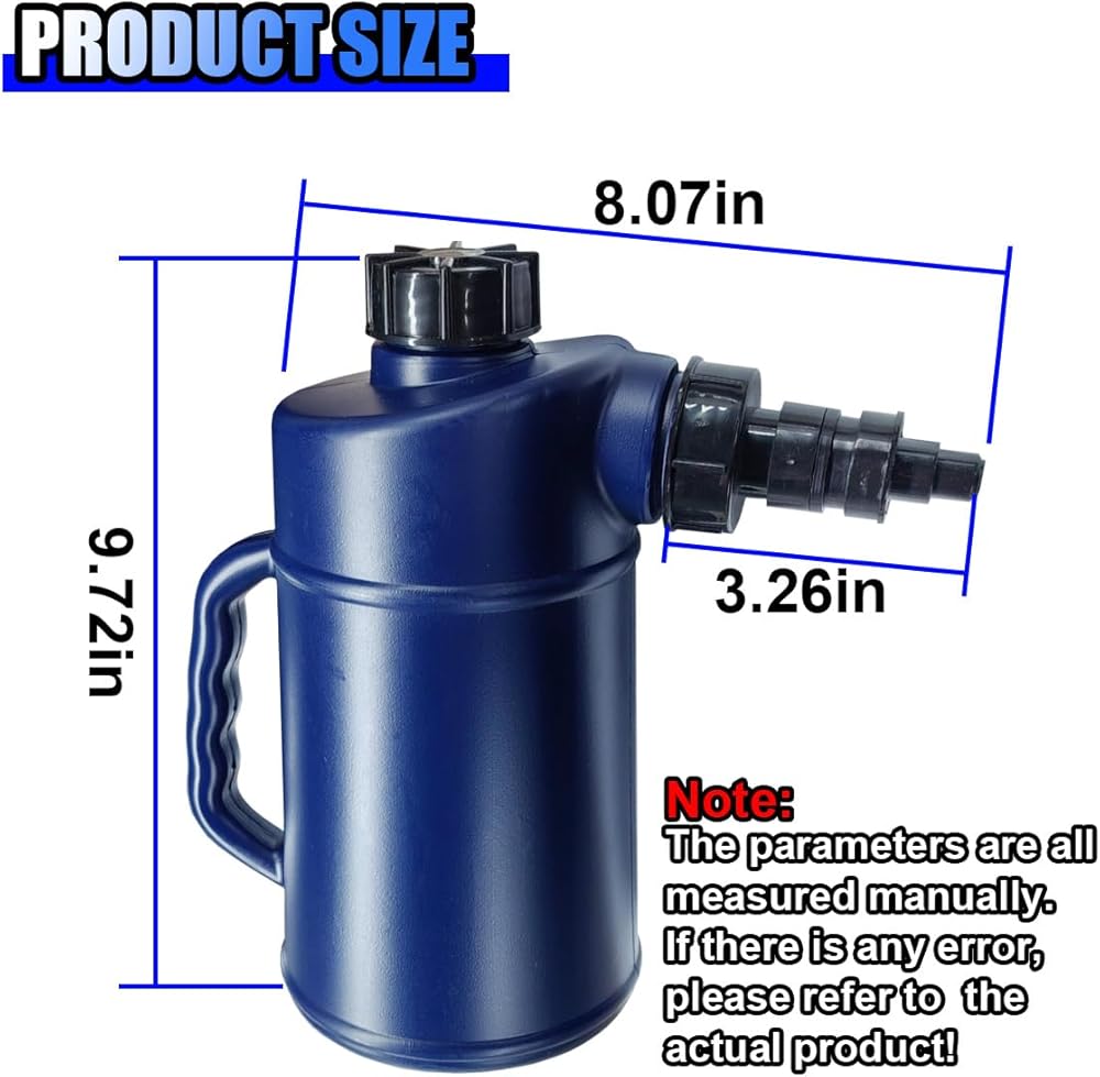 【Size】: This car battery water filler measures 8.07 x 9.72 inches in size, allowing it to be flexibly placed in any corner of the garage or workshop without taking up much space. With a capacity of 2 liters, it can meet the single-time fluid replenishment needs of most car batteries, effectively improving work efficiency.