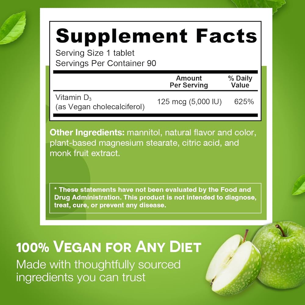• ابدأ روتينًا يوميًا - اجعل من السهل عمل فيتامين D3 الذي يذوب في جدولك المزدحم. استمتع بأقراص فيتامين التفاح الأخضر اللذيذة التي يسهل تناولها، حتى أثناء التنقل. لا مزيد من الفيتامينات السكرية، فقط المحليات المشتقة من النباتات