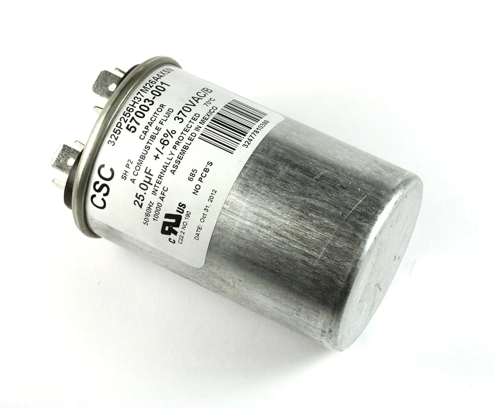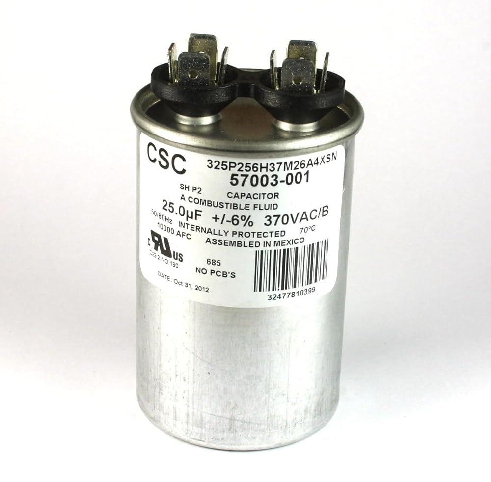 This CSC Motor Run Capacitor is a robust electrical component designed for reliable performance in motor applications. Featuring a 25μF (microfarad) capacity with a +/-6% tolerance and 370VAC rating, this capacitor delivers consistent power factor correction and motor starting capabilities. The durable metal housing measures 3.25 inches by 1.75 inches, providing excellent protection for the internally protected assembly. Built for industrial and commercial applications, this capacitor operates efficiently at 50/60Hz with a temperature rating of 70°C. The unit is UL listed for safety assurance. Perfect for HVAC systems, pump motors, and other industrial motor applications where reliable capacitance is crucial. This model features a combustible fluid design and is manufactured without PCBs, ensuring long-term reliability. The clear labeling and professional-grade construction make it an ideal replacement part for various motor applications.