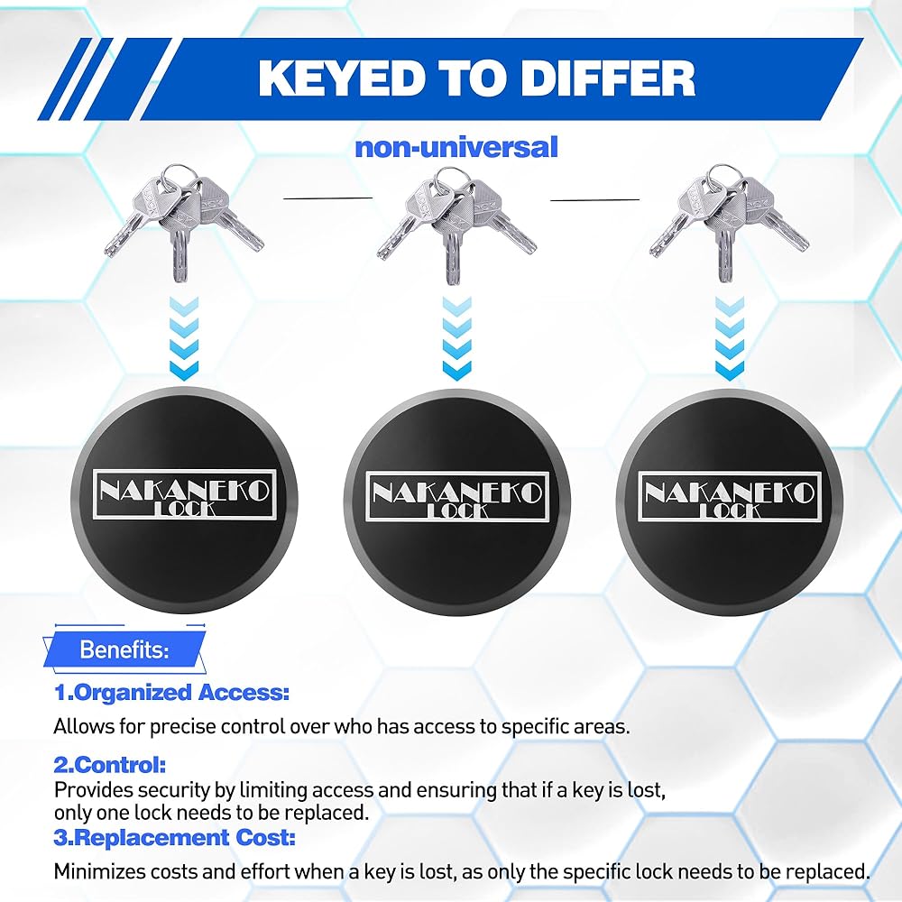 UNIQUE KEY DESIGN: Our puck locks have a special key design that prevents anyone from picking them or making a copy of your lock keys; Each lock comes with 3 keys;
