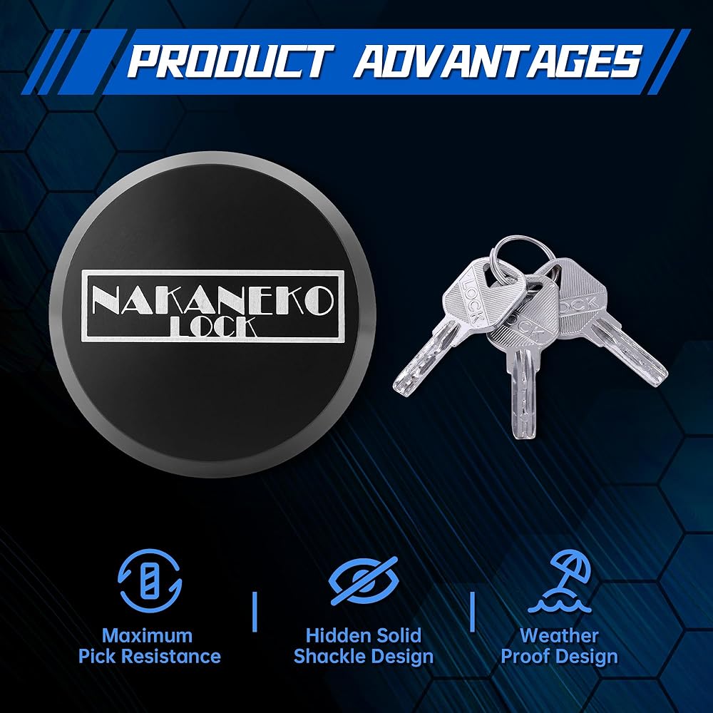 Protects against bolt cutters, no exposed shackle to cut or saw; Provides maximum security against drilling, sawing and prying; Key retaining safeguard ensures padlock is not left unlocked; NAKANEKO puck lock provide ideal security for your van, trailers, gates, trucks, garden shed, warehouse, container, factory, hous