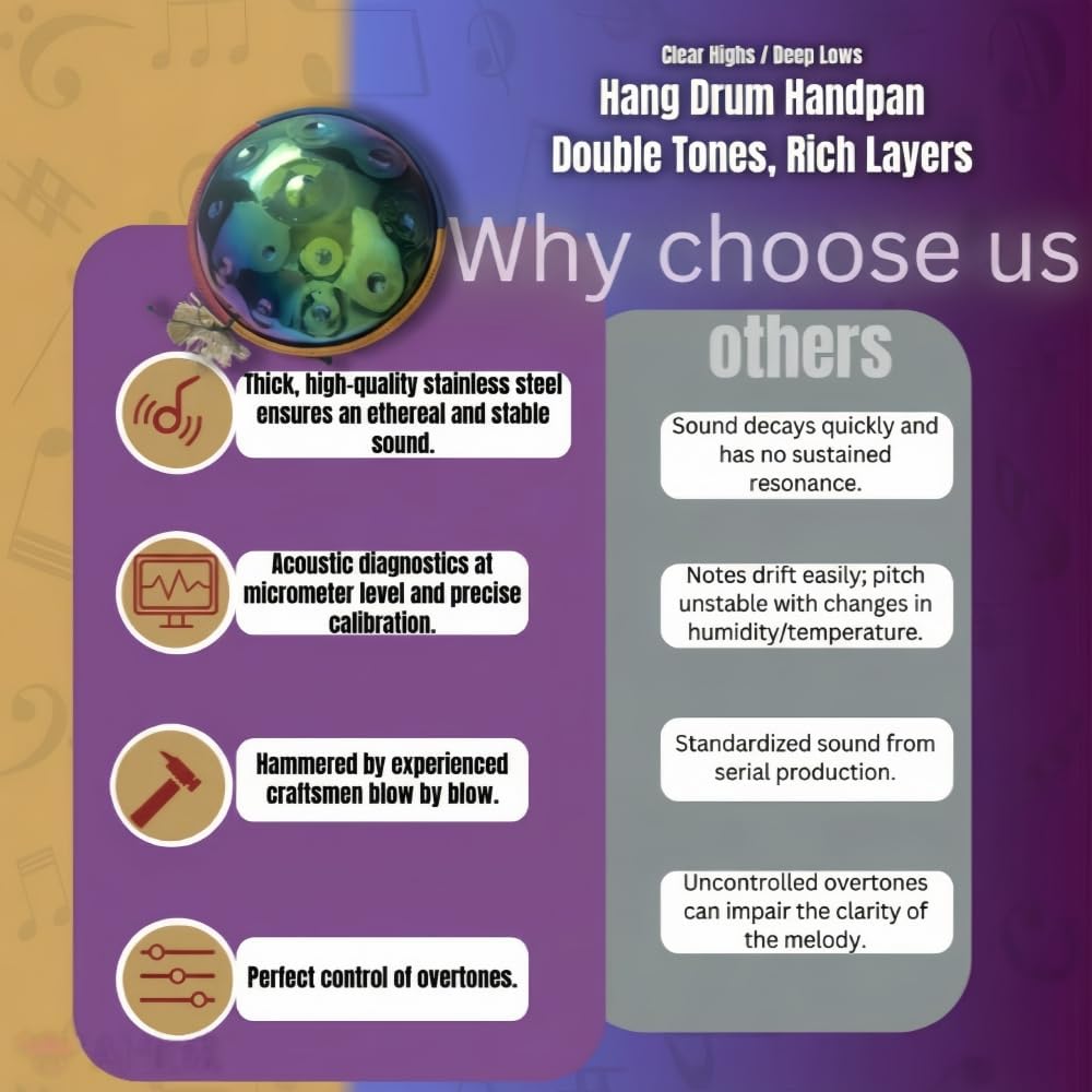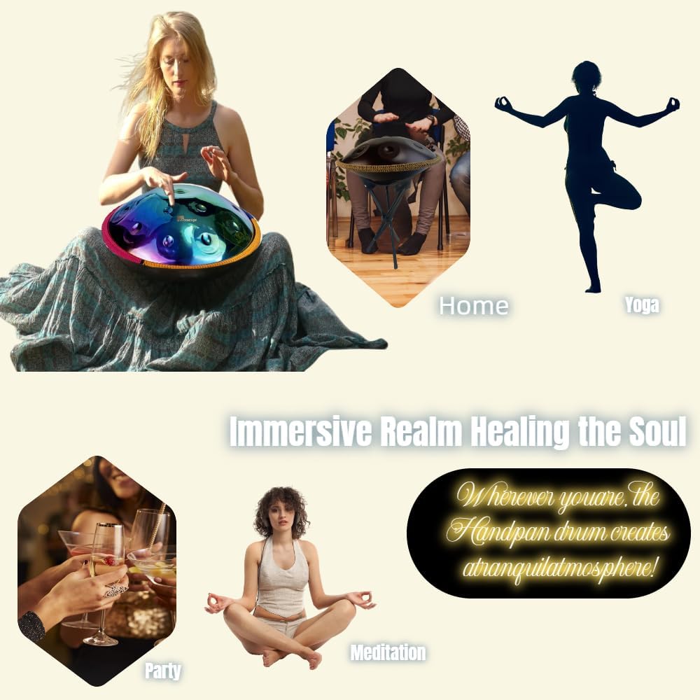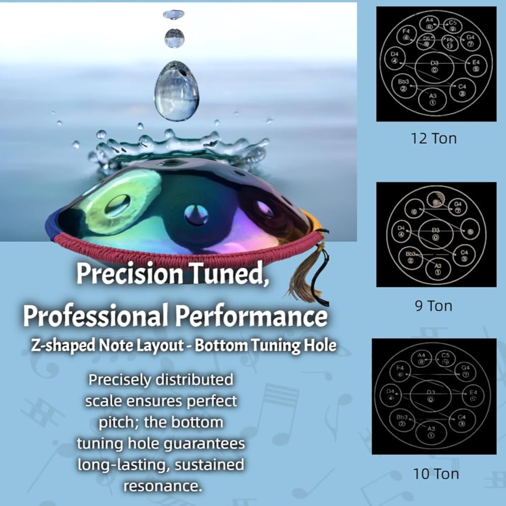 Experience the Serenity of Handpan: Your Gateway to Sonic Bliss Discover the enchanting world of handpans – a uniquely crafted melodic percussion instrument designed for healing and relaxation. Our handpans, available in various sizes and tunings, offer a truly immersive musical experience. The 22-inch D Minor handpan (tuned to 440Hz), with 9/10/12/14 notes, produces ethereal and captivating melodies that resonate deeply within your soul. Whether you're a beginner exploring the power of sound or a seasoned musician seeking inspiration, our handpans provide a perfect avenue for creative expression and mindful practice. Immerse yourself in the soothing frequencies and experience the profound sense of peace and tranquility that handpan music offers. Each handpan is meticulously handcrafted, embodying art, physics, engineering, and metallurgy. Two sheets of metal, carefully shaped into a dome approximately 50cm in diameter with a thickness of 0.91-0.95mm, undergo a complex forging process. This includes multiple firings in high-temperature kilns (600°C, then 400°C), which drastically improves the steel's resilience and tonal qualities. Skilled artisans then meticulously hand-hammer each note, fine-tuning the internal resonance and pitch. This labor-intensive process requires immense skill and precision, as the interconnected notes demand perfect tuning to avoid interference. Finally, the seam is sealed for durability, ensuring the handpan's longevity. Choose your perfect handpan and begin a journey of self-discovery through sound. Explore the healing power of music and uncover the unique connection between your soul and these captivating instruments. Order yours today and let the journey begin!