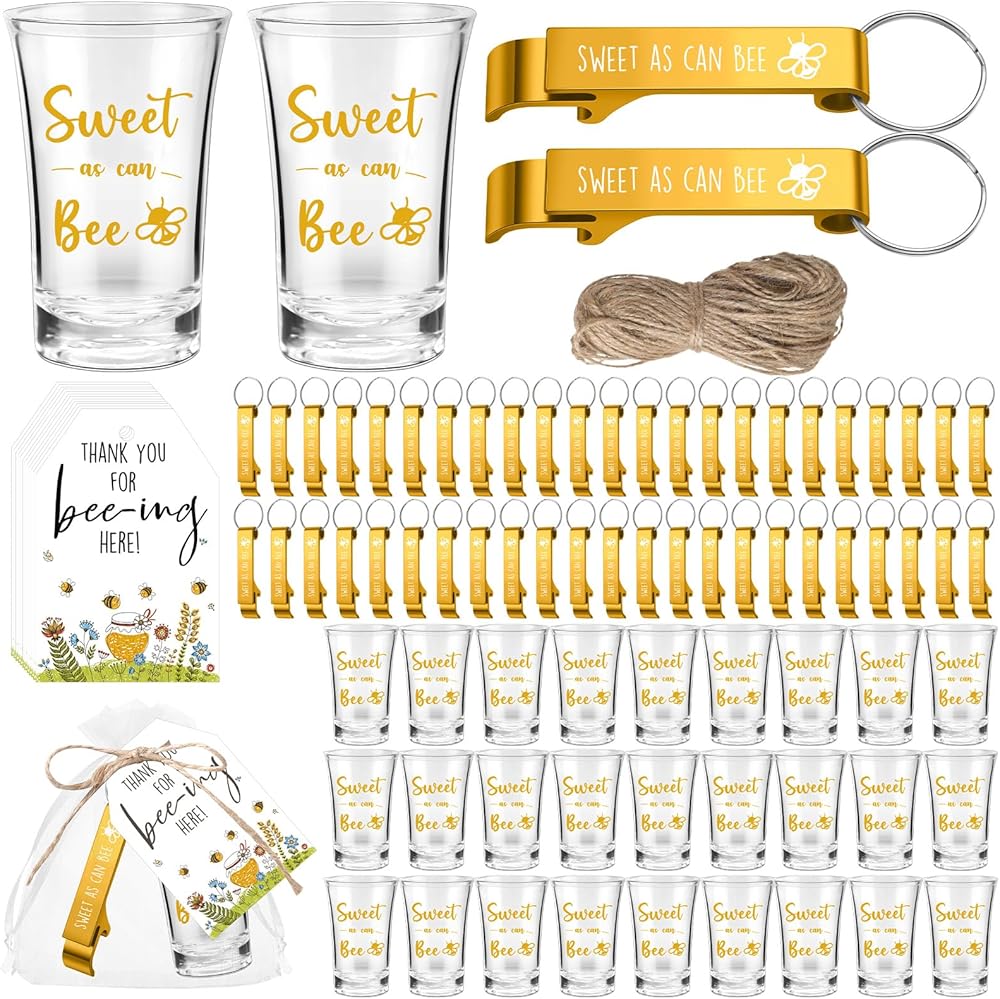 • Bee Baby Shower Party Favor Set: you will receive 25 sets of baby shower gifts for guests, including 25 acrylic wine glasses, 25 bottle opener keychains, 25 thank you tags, 25 organza bags and a 20 meters roll of hemp rope, the quantity is enough to meet your gift needs