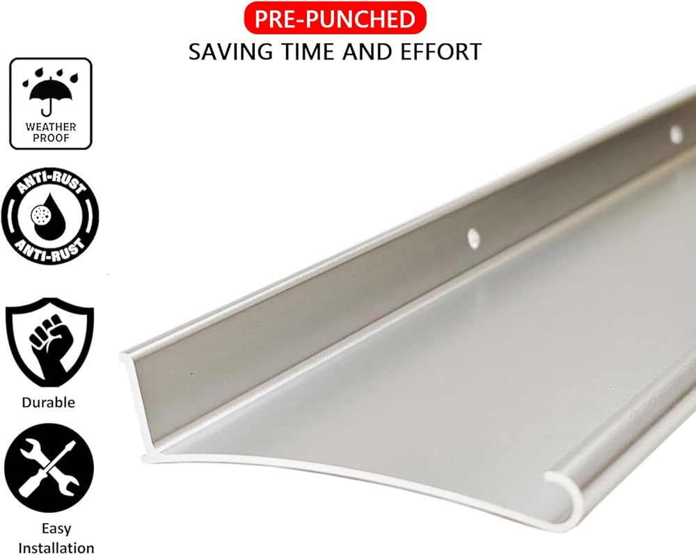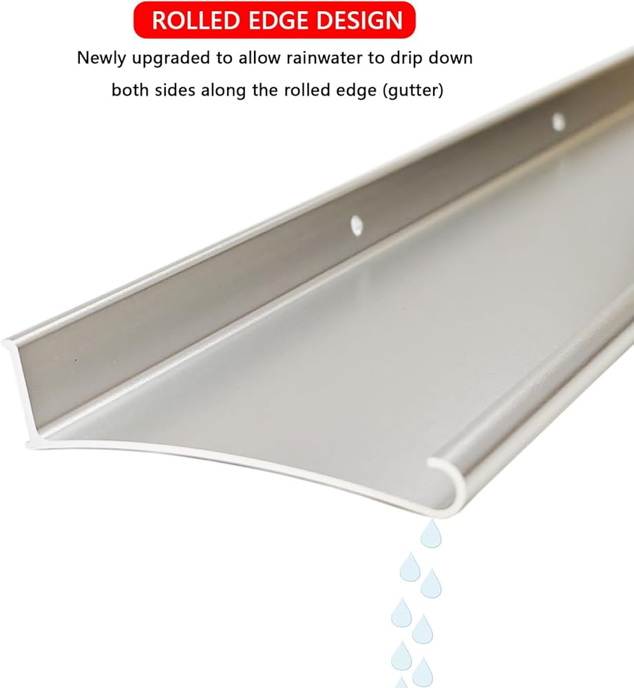 Extra-wide Door Rain drip Guard: Unlike all other door rain drip guards, ours is designed with extra-wide and extra-thick aluminum material, with a width of 5.12"/13cm and a maximum thickness of 2.5mm,The length reaches 110cm/43.3inch. It is wider and stronger than all other exterior door and window rain drip guards, exterior door water deflectors, and rainwater diverters, and has a better rain splash protection effect.