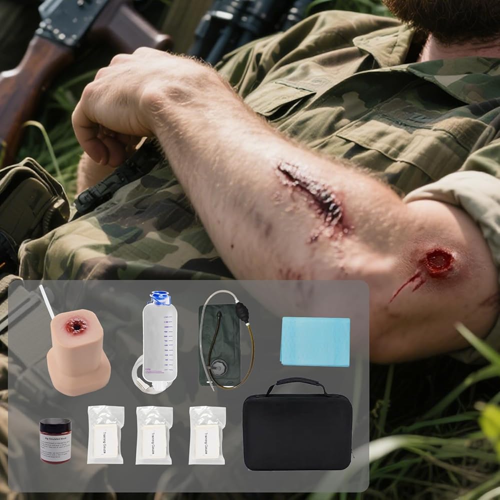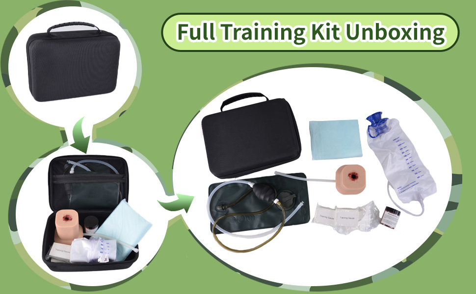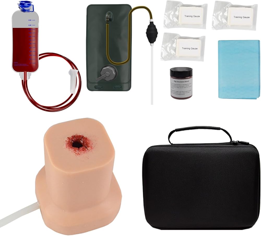 • مجموعة All-In-One: تشمل محاكاة جرح الرصاص النابضة بالحياة ، حقيبة خزان ، حقيبة مضخة الدم ، وسادة امتصاص ، مواد دم محاكاة وشكّل التدريب للسيناريوهات الطبية الأصيلة.