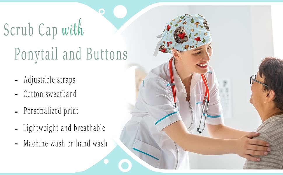 تصميم الأزياء: يعرض غطاء فرك المرأة طباعة مخصصة ويتضمن حلقة شعر مطابقة ؛ تم تصميم غطاء Scrub مع ذيل الحصان بأنماط زاهية ، مما يجعل قبعة فرك المرأة ليس فقط عنصرًا وظيفيًا ولكن أيضًا ملحقًا أنيقًا يضيف لمسة جديدة وحديثة إلى روتينك اليومي