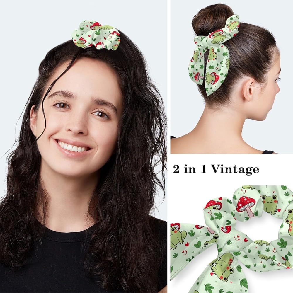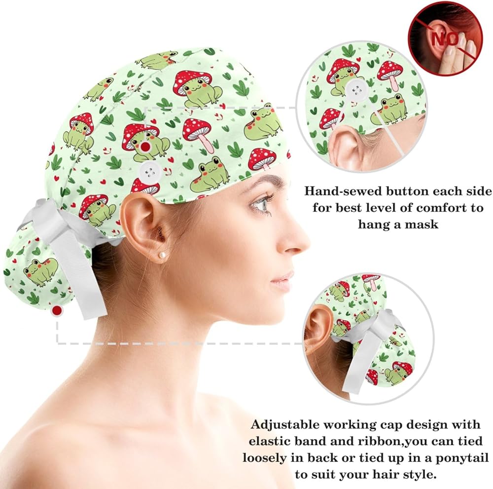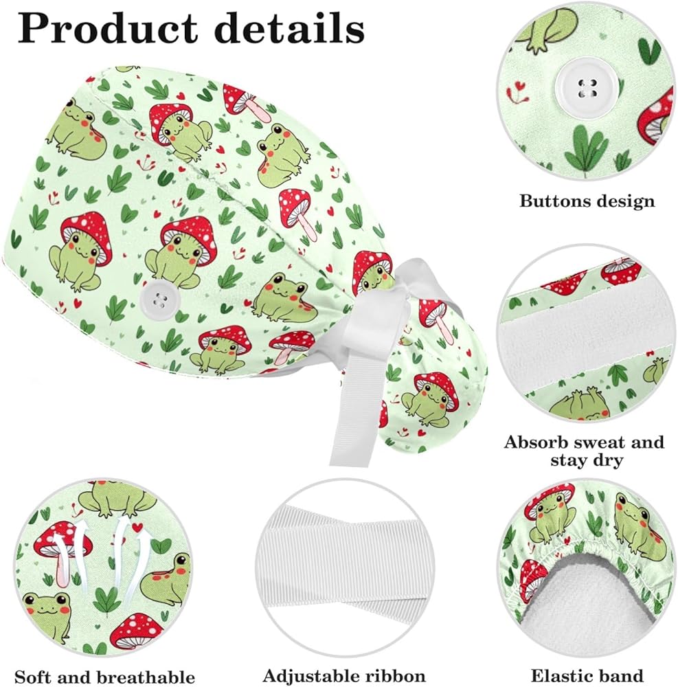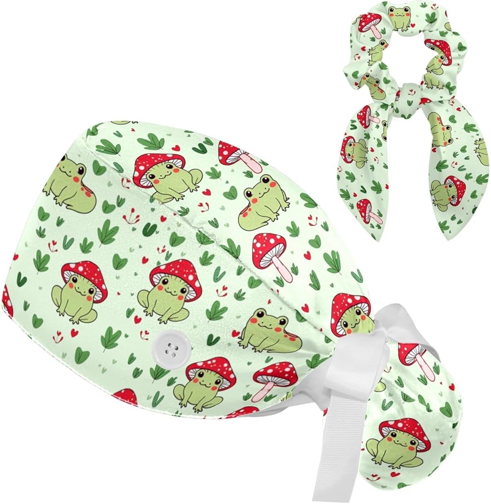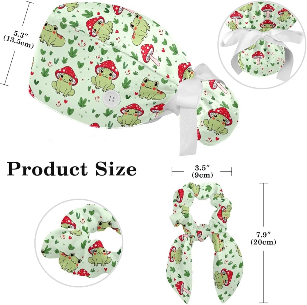 قبعات فرك النساء ، والأغطية الجراحية للنساء مع حقيبة ذيل حصان وأزرار ، وقبعات فرك بوفانت مع القوس scrunchie للشعر الطويل ، وضفدع الفطر نبات القلب على خضراء فاتحة